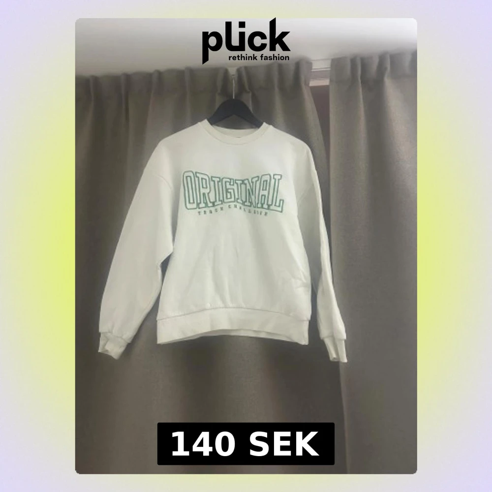Vit sweatshirt med grön text 'ORIGINAL' och mindre text under. Tröjan har rund hals, långa ärmar med muddar och ribbad nederkant. Perfekt för chill dagar och enkel att matcha med jeans eller joggers.