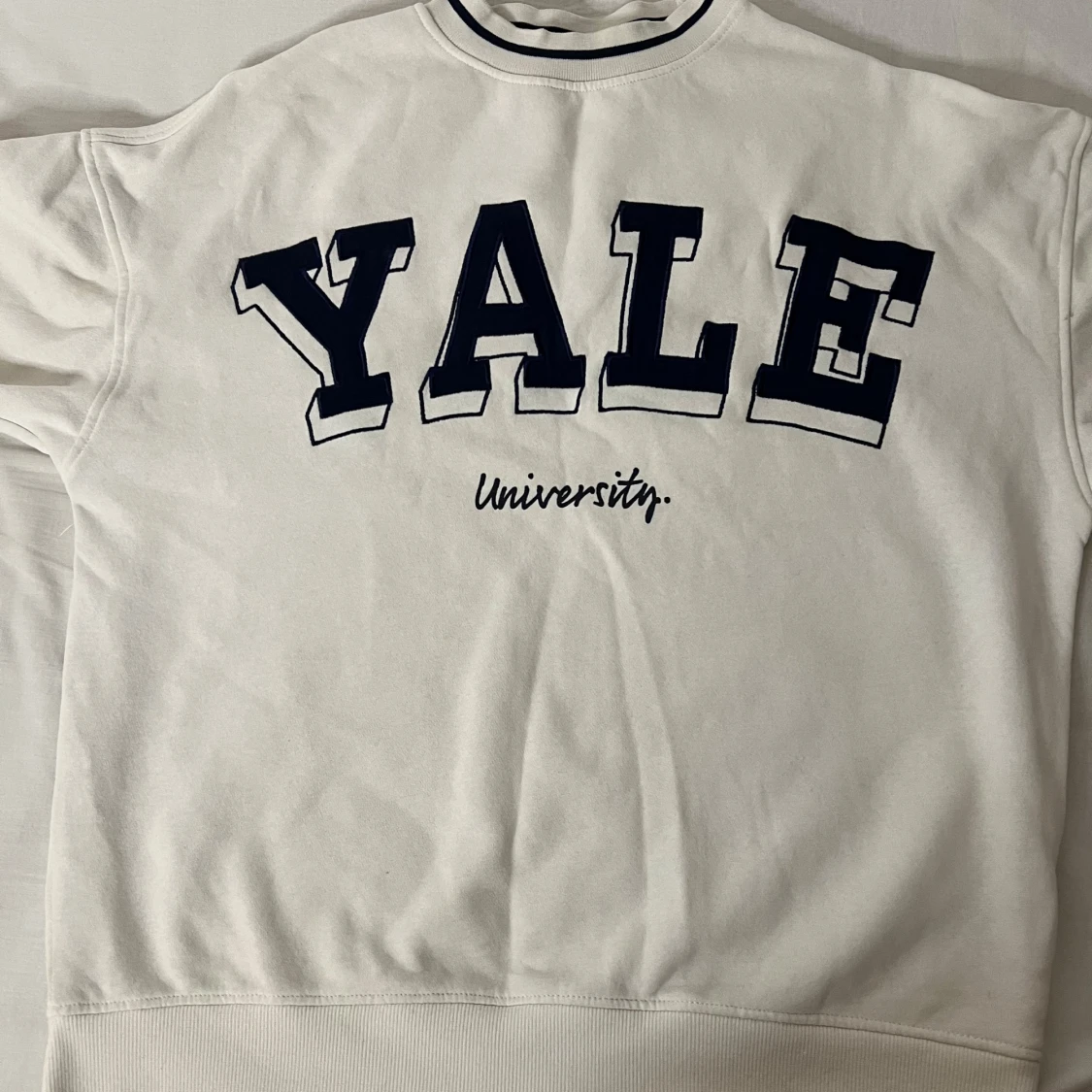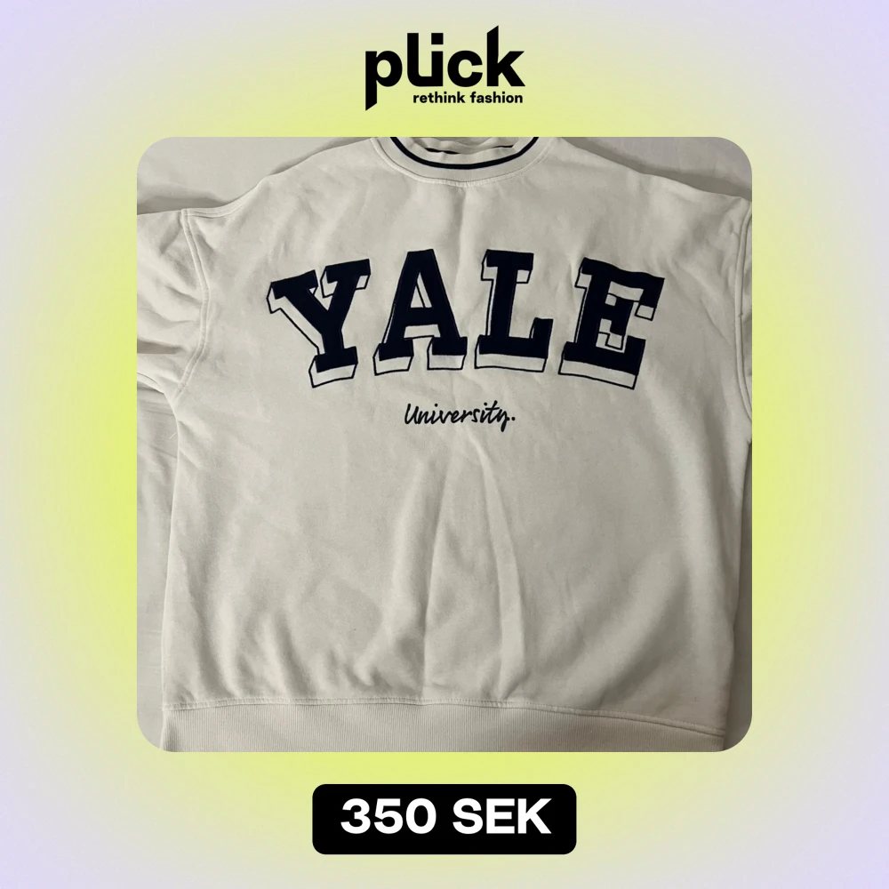 Säljer en vit sweatshirt med stort Yale University-tryck på framsidan och siffran 19 på ärmen. Perfekt för en avslappnad stil eller för att visa ditt stöd för Yale! Tröjan har en normal passform och är gjord i mjukt bomullsmaterial.