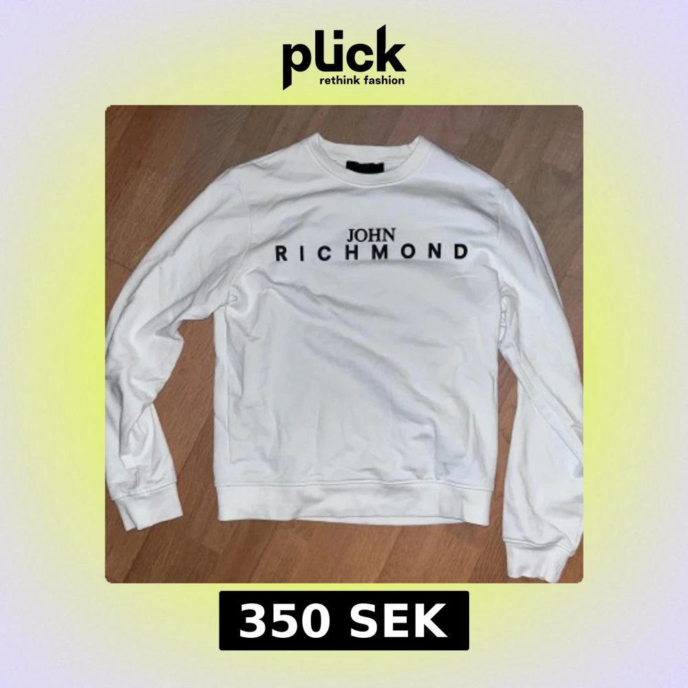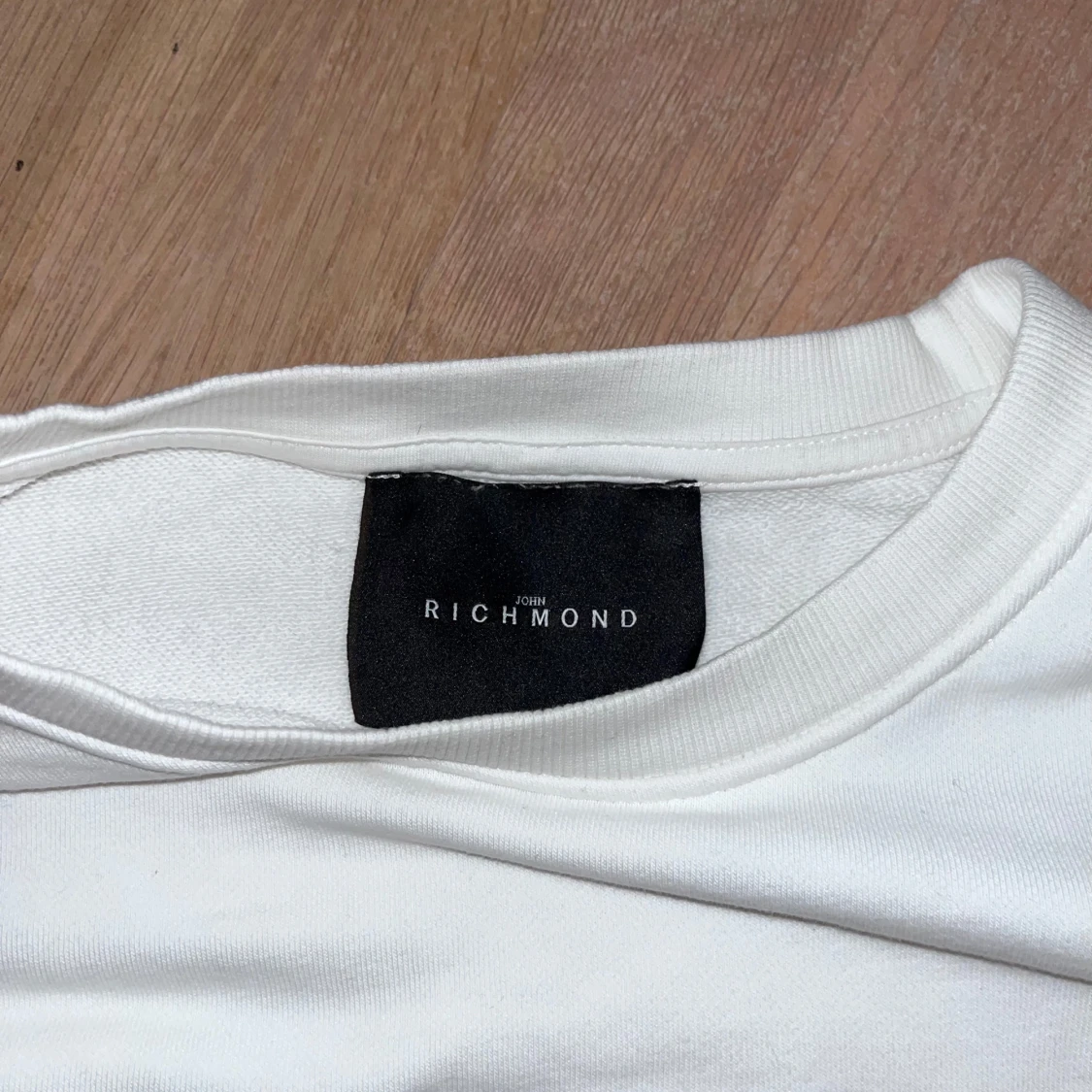 Säljer en stilren vit sweatshirt från John Richmond med svart logotyptryck på bröstet. Tröjan har rund hals, långa ärmar och ribbade muddar vid ärmslut och nederkant. Perfekt för dig som gillar cleana och enkla designer.