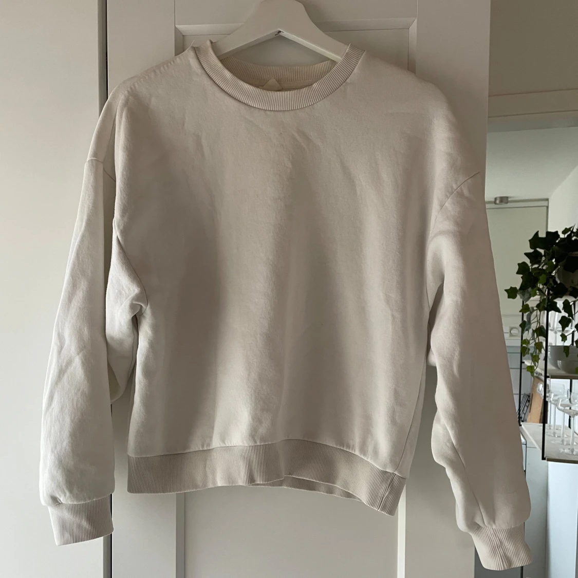 Säljer en stilren vit sweatshirt med rund hals och långa ärmar. Perfekt för en avslappnad look. Tröjan har ribbade muddar vid ärmslut och nederkant.