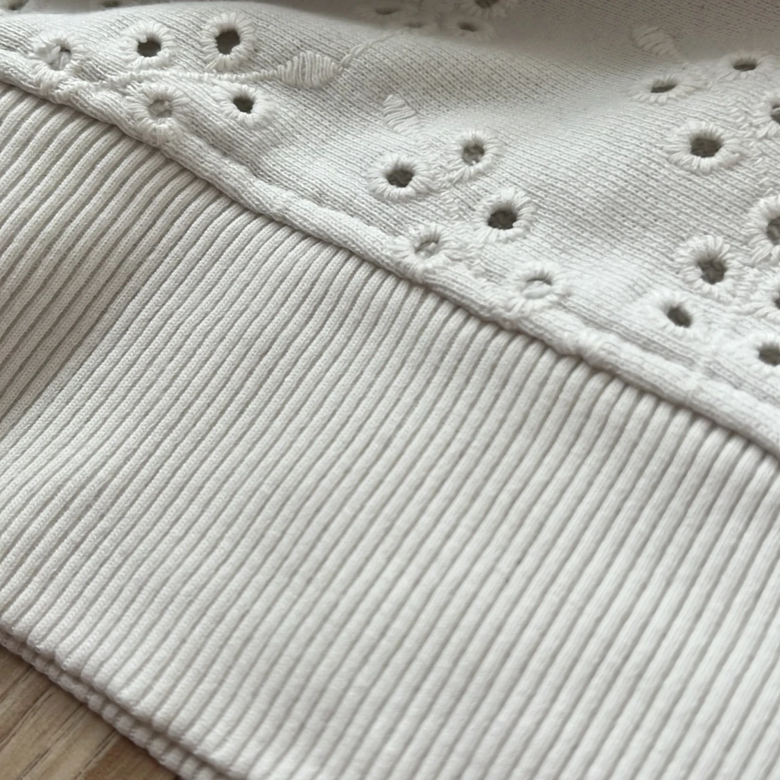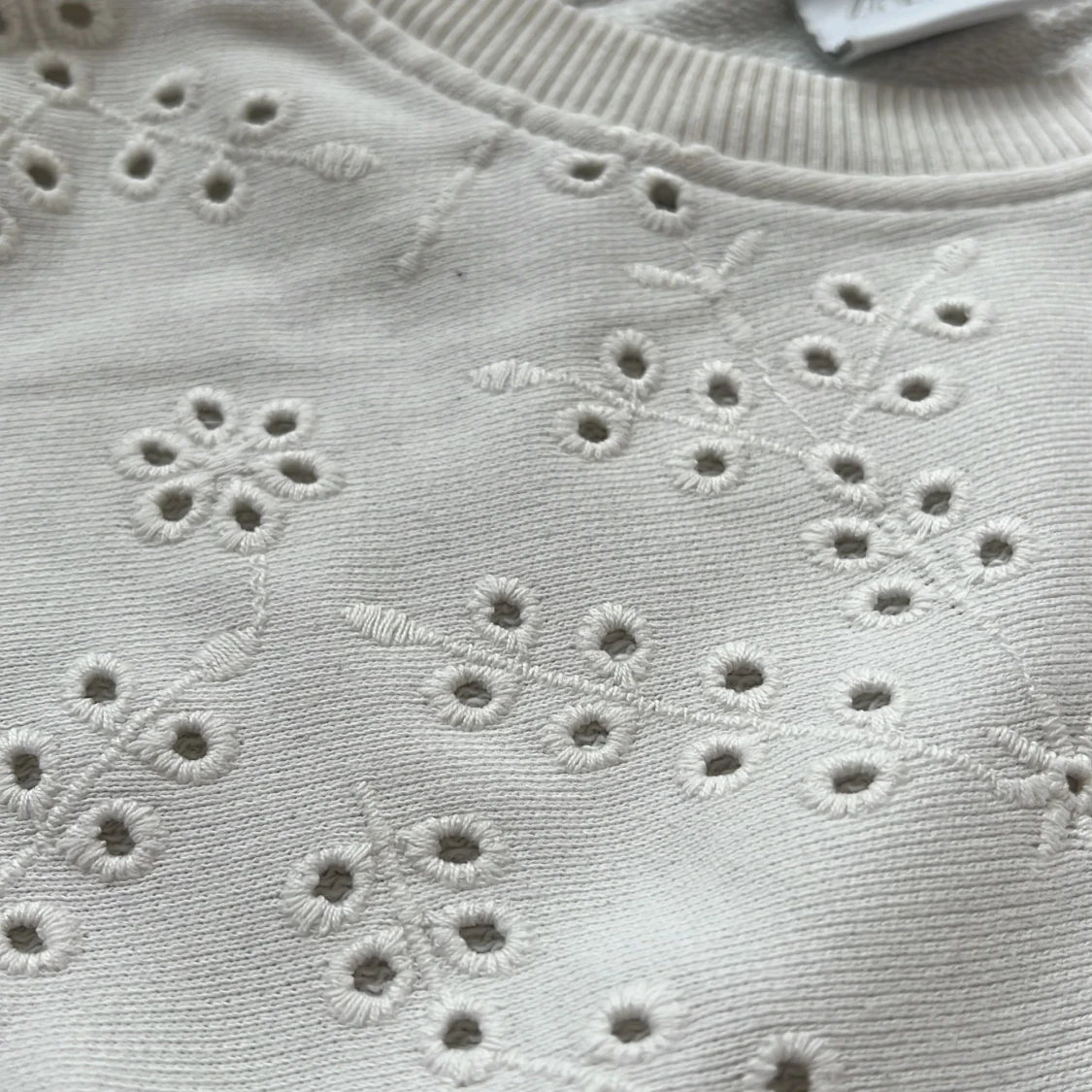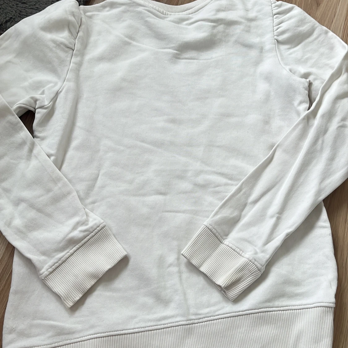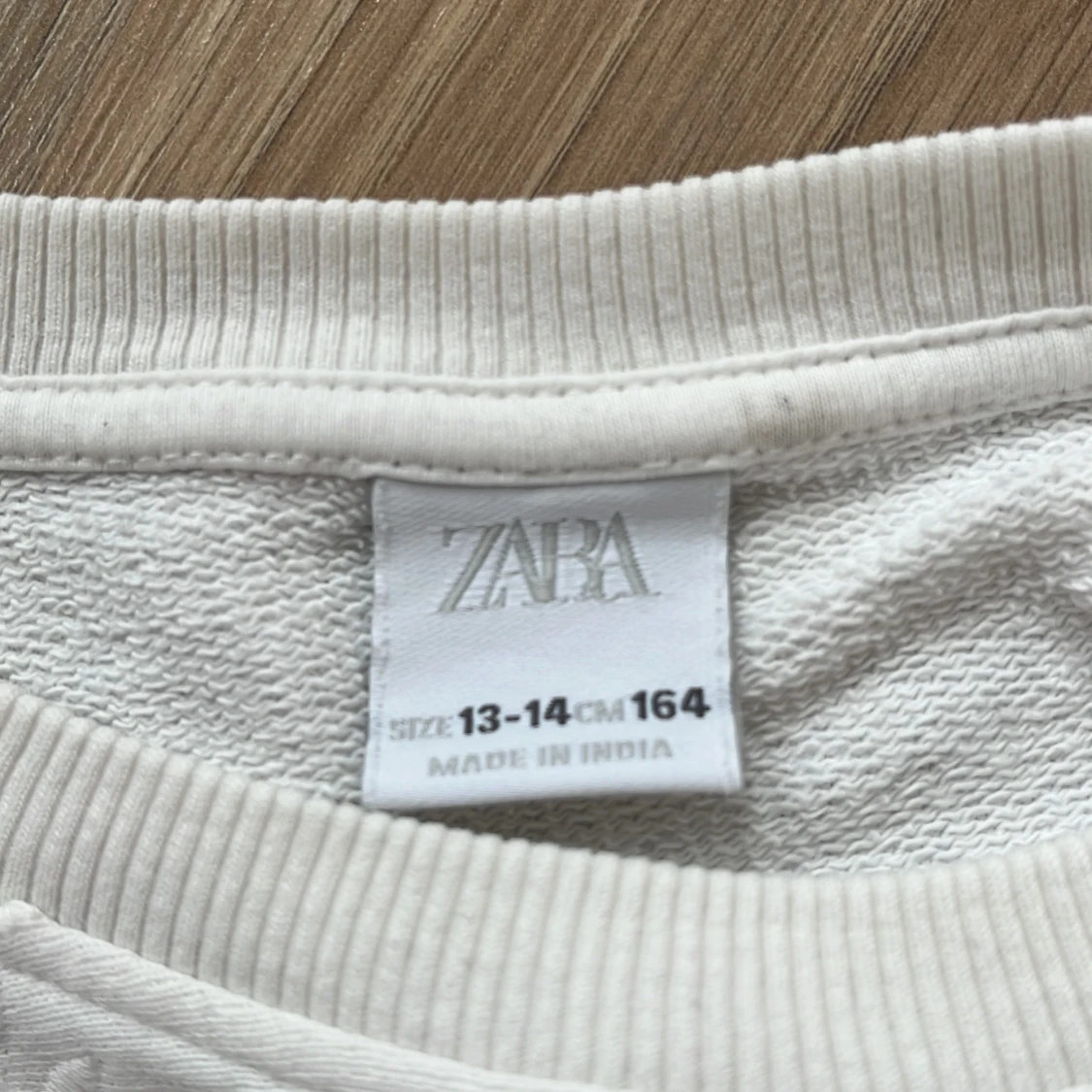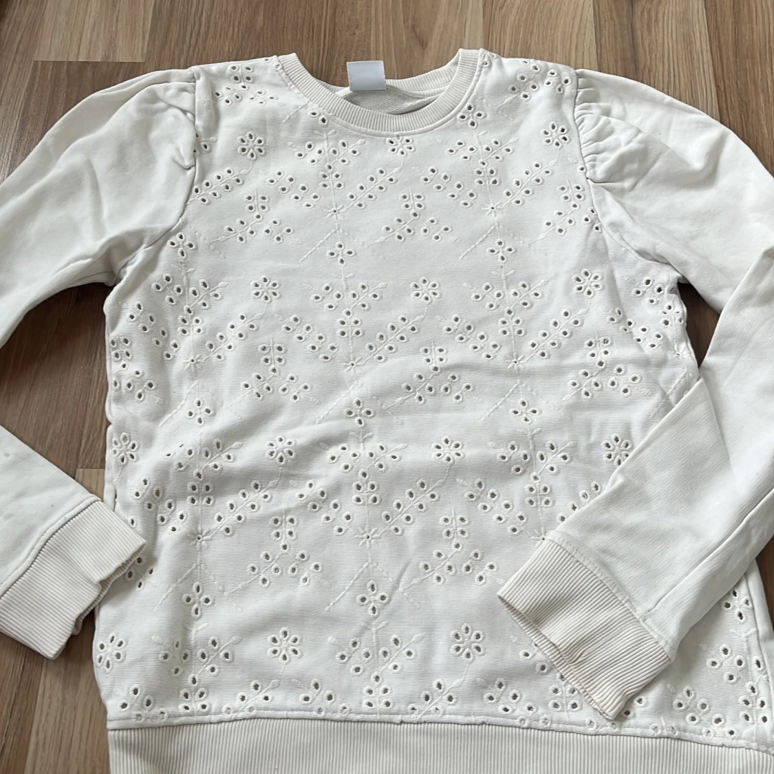 Superfin vit tröja från Zara med broderade blommor framtill. Tröjan har rund hals, puffade axlar och långa ärmar med breda muddar. Materialet är mjukt och bomulligt, perfekt för en chill och stilren look.