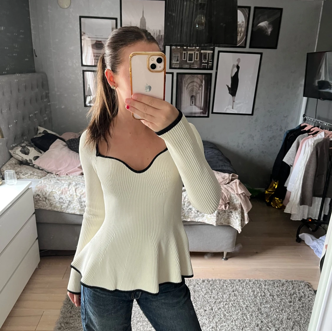 Säljer en gullig vit ribbad topp från H&M med som har en fin urringning. Toppen har långa ärmar och en lätt utsvängd nederdel som ger en fin silhuett. Endast använd fåtal gånger.