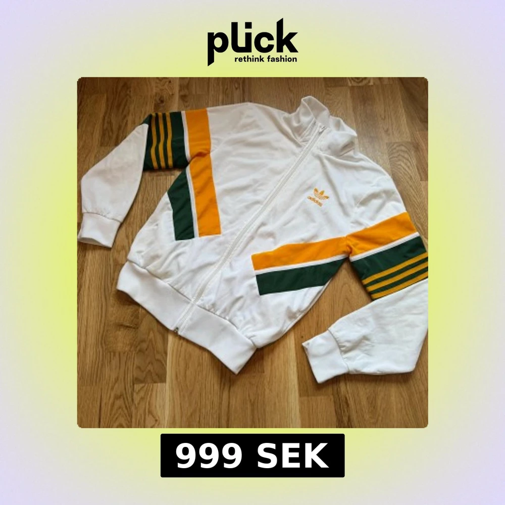 Säljer en snygg vit träningsjacka från Adidas med dragkedja. Jackan har coola gröna och orange detaljer på ärmarna och bröstet. Perfekt för en sportig look!