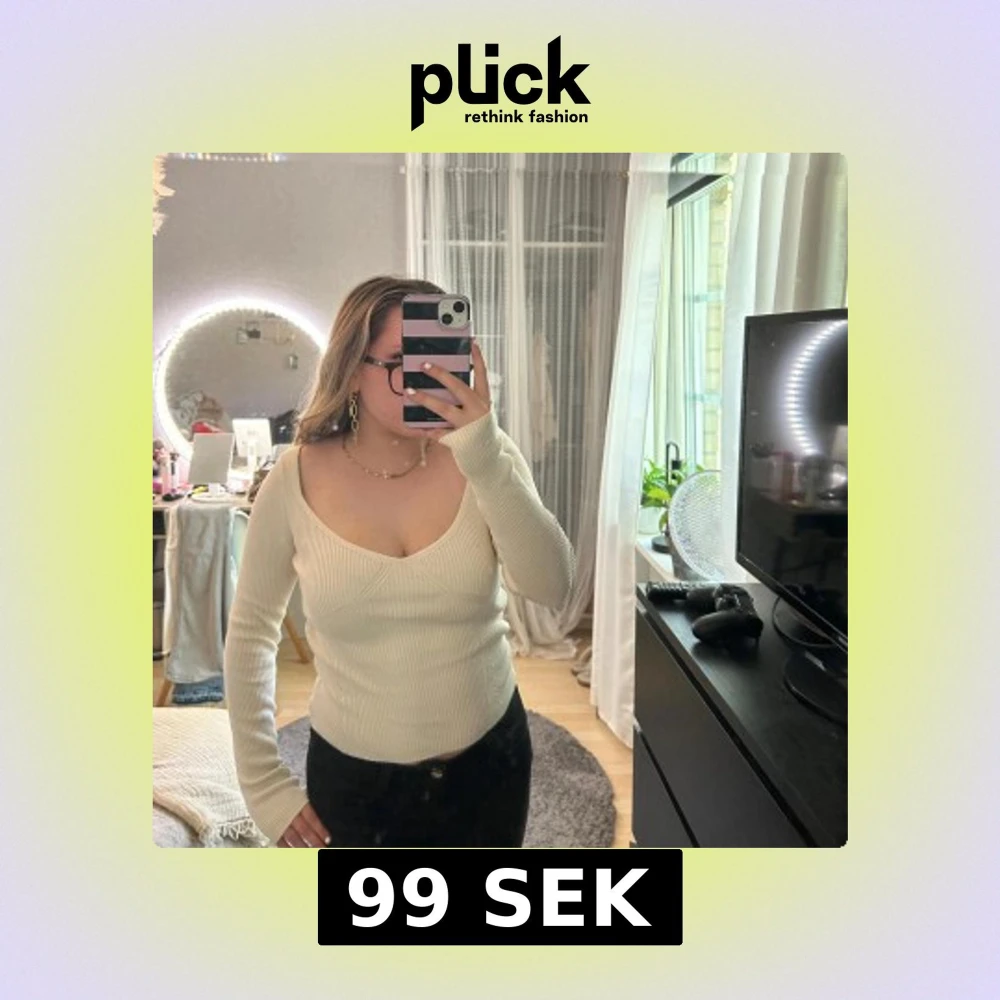 Säljer en vit ribbad tröja som är v-ringad. Tröjan har långa ärmar och en figurnära passform. Köpt från Gina Tricot och använd fåtal gånger