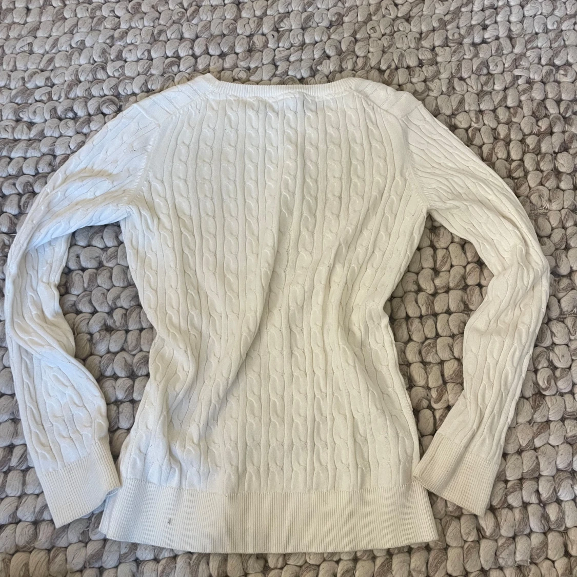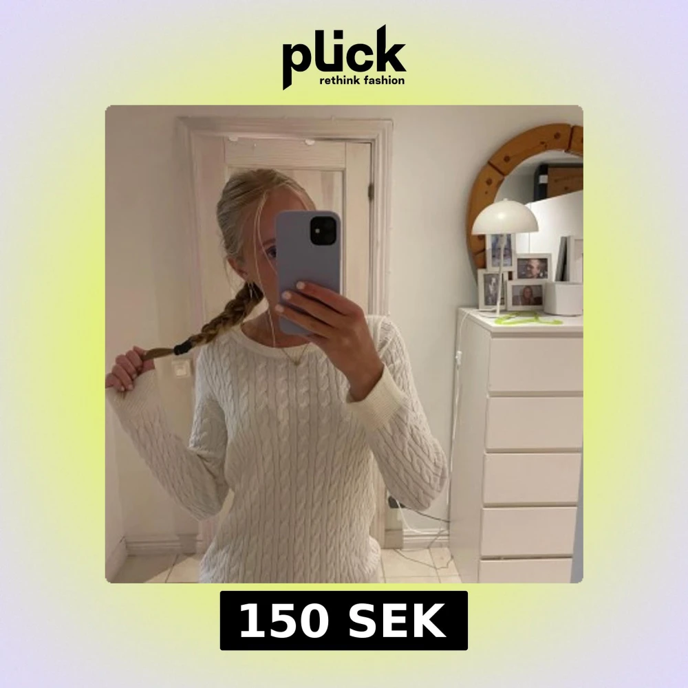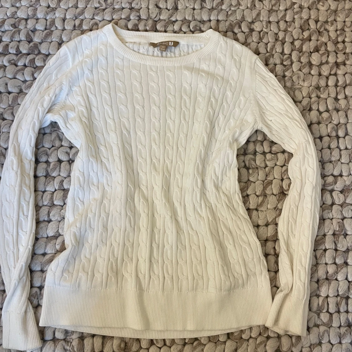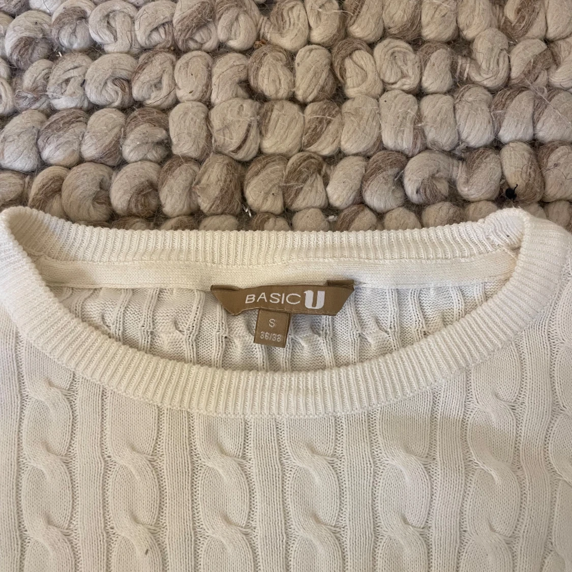 Snygg vit kabelstickad tröja från BASIC U i storlek S. Tröjan har rund hals och ribbade muddar. Materialet är mjukt och skönt.