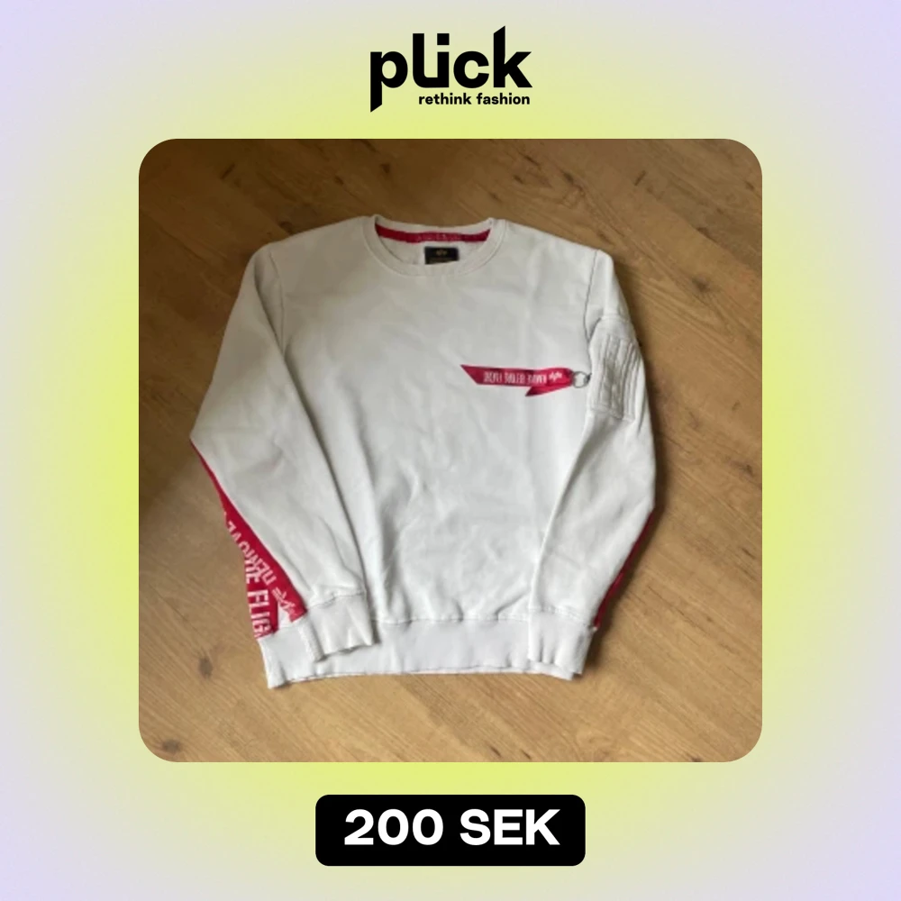 Säljer en snygg vit tröja från Alpha Industries. köpte den för 1300kr skicket är bra.
