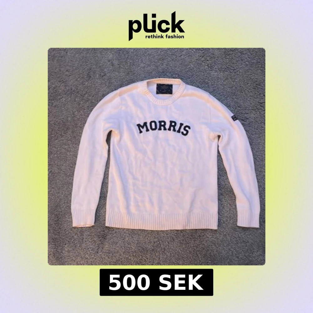 Säljer en stilren vit tröja från Morris med texten 'MORRIS' i svart på bröstet. Tröjan har långa ärmar och ribbade muddar vid ärmslut och nederkant. Perfekt för en avslappnad och snygg look.