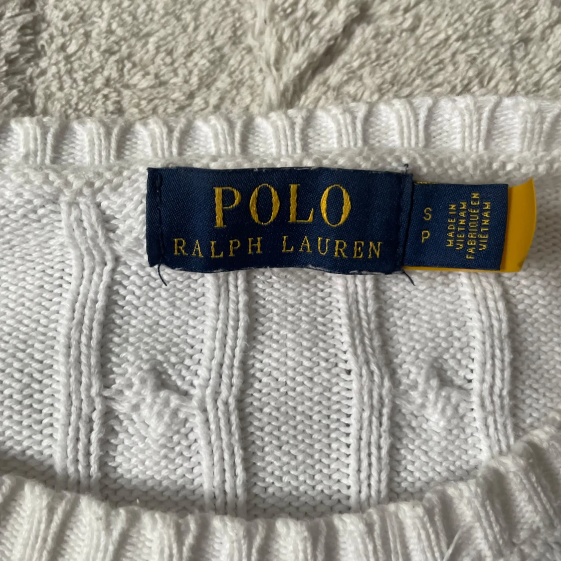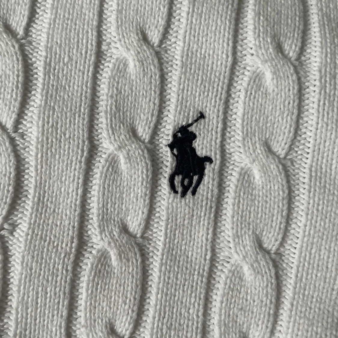 Säljer en stilren vit kabel tröja från Polo Ralph Lauren med det klassiska logotypbroderiet på bröstet. Tröjan har en kabelstickad design och långa ärmar, perfekt för kyligare dagar. I storlek S men kan nog passa xs