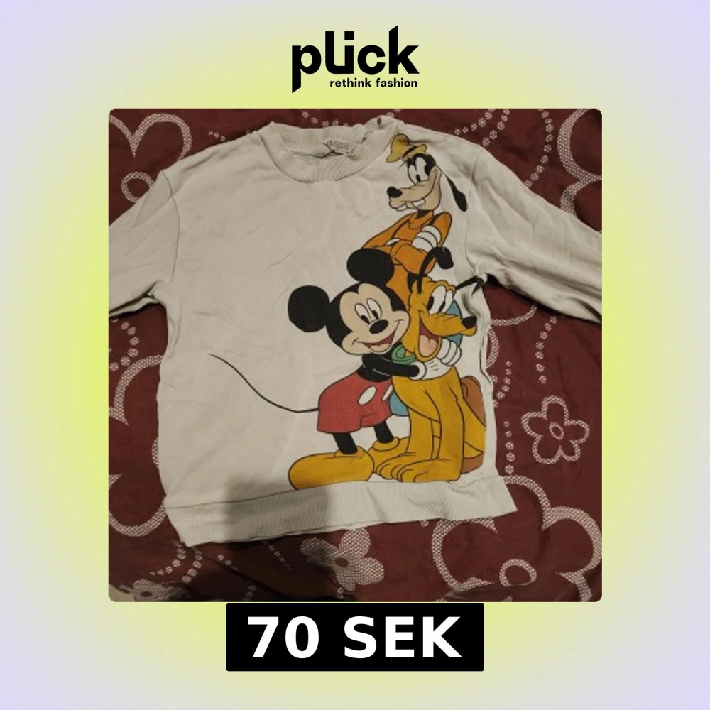 Säljer en vit tröja med ett stort tryck av Disney-karaktärer på framsidan och texten 'Mickey Mouse & Friends' på baksidan. Tröjan har långa ärmar och en rund halsringning. Perfekt för alla Disney-fans!
