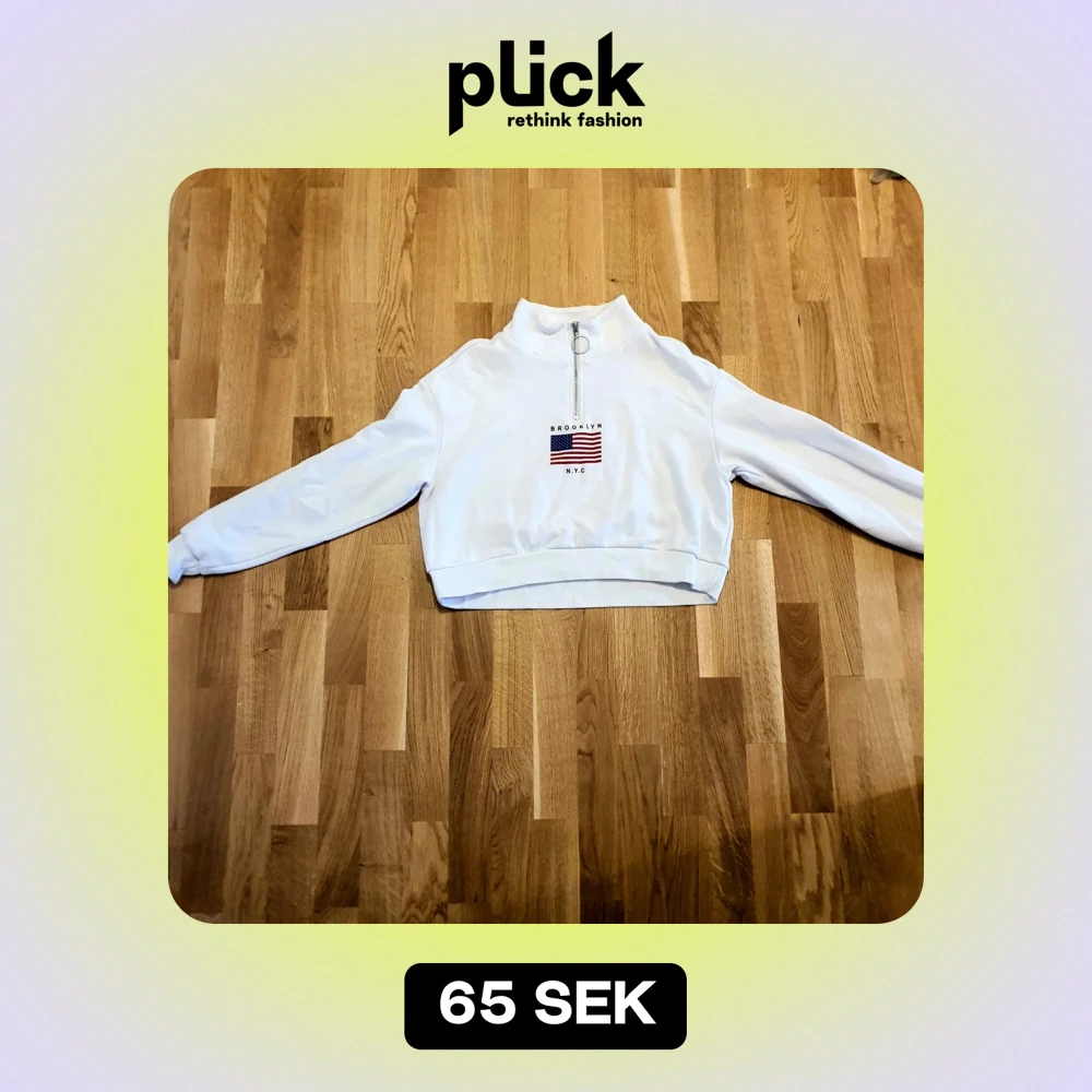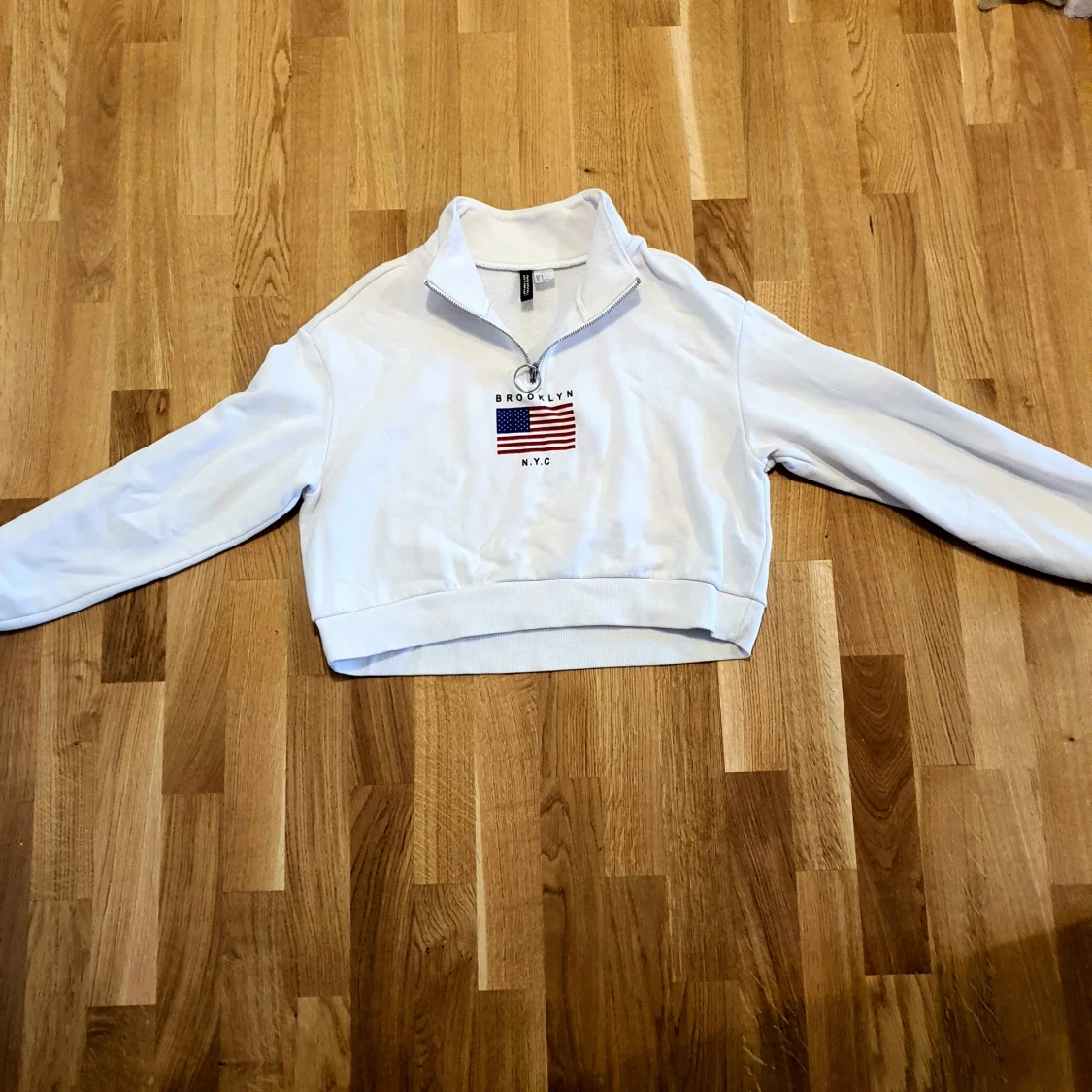Säljer en vit tröja från Divided med halv dragkedja och tryck av amerikansk flagga samt texten 'Brooklyn NYC'. Tröjan har långa ärmar och en croppad passform. Perfekt för en avslappnad stil!
