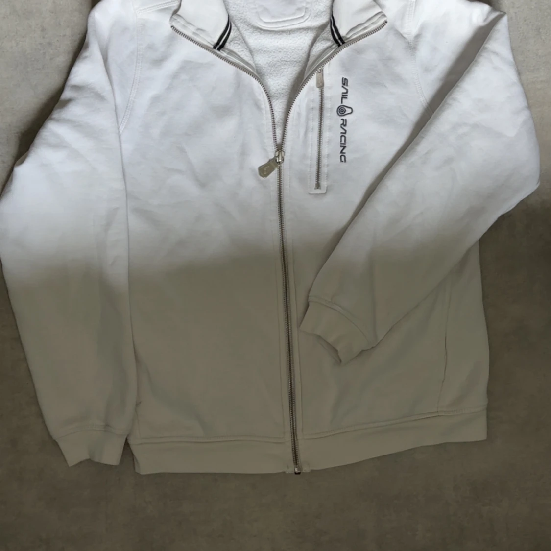 Vit jacka från Sail Racing med hel dragkedja och ståkrage. Jackan har en bröstficka med dragkedja och logga på vänster sida. Tillverkad i mjukt bomullsmaterial och har långa ärmar med muddar. Perfekt för en clean och sportig stil.