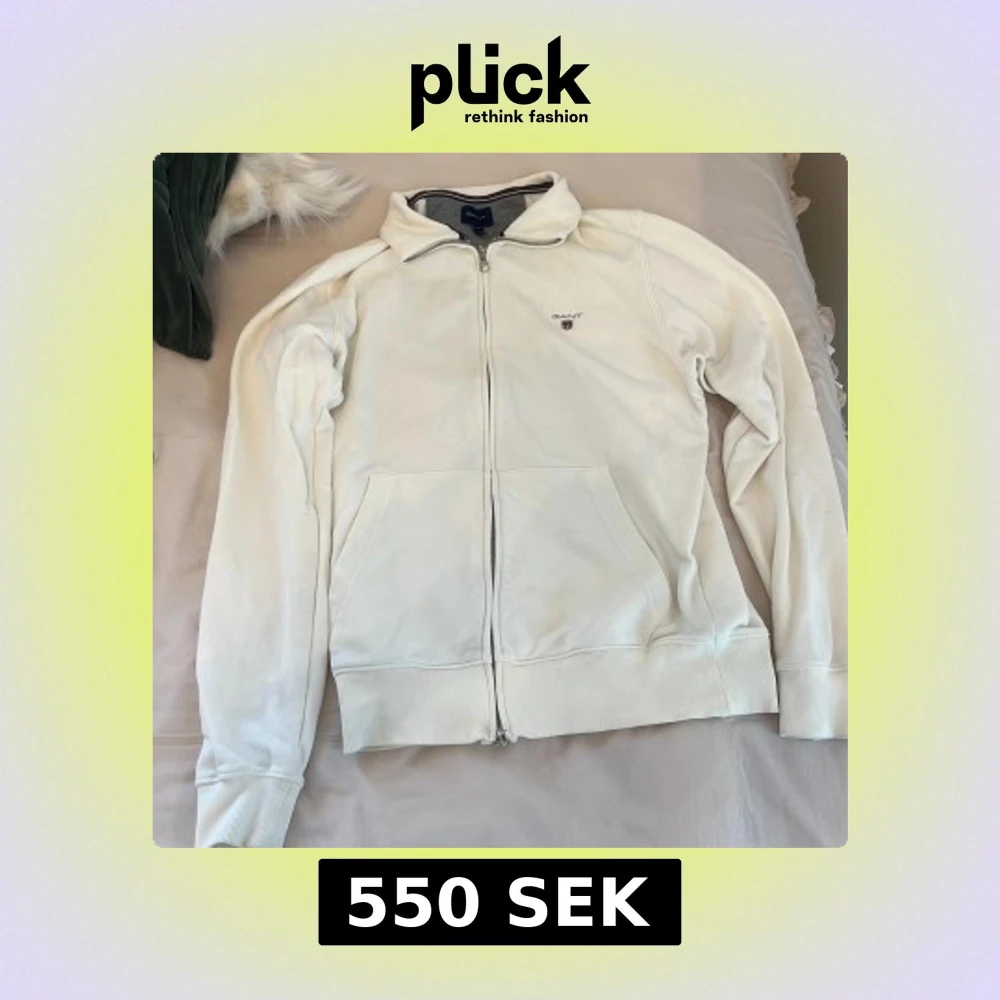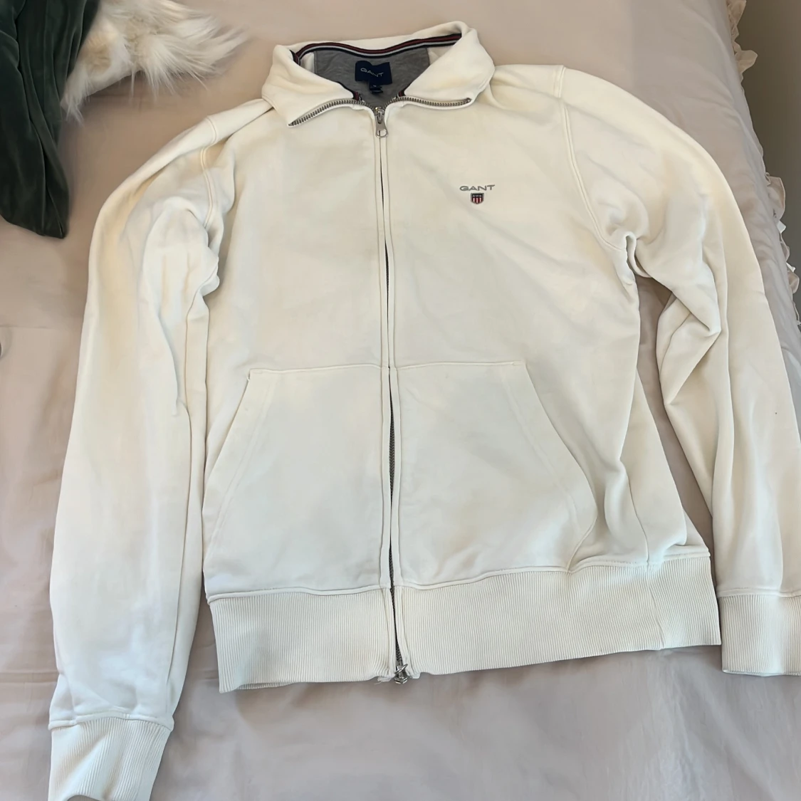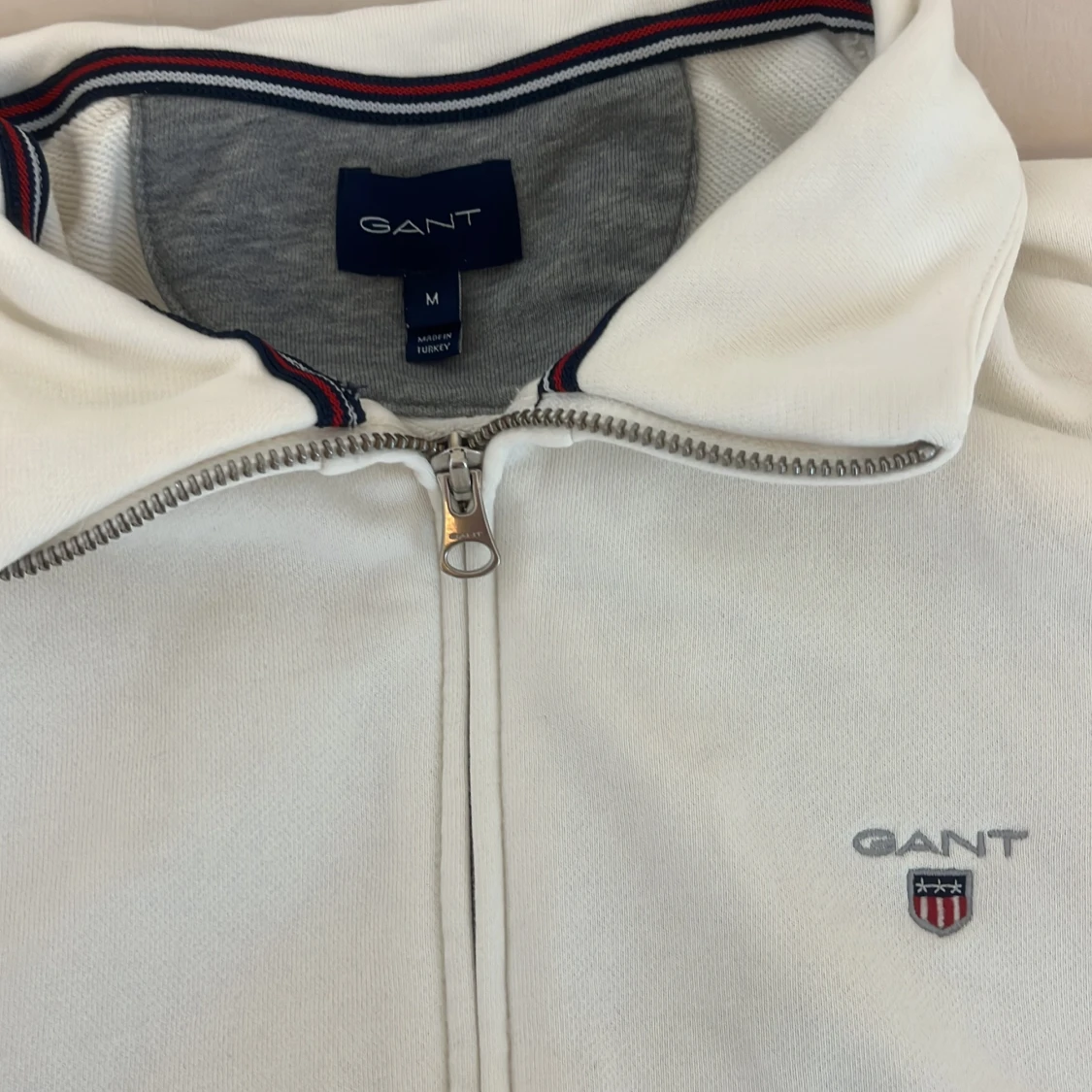 Säljer en stilren vit ziptröja från Gant med broderad logga på bröstet. Tröjan har hel dragkedja, ribbade muddar och krage med snygg randig detalj på insidan. Tillverkad i mjuk bomull och har två fickor framtill.