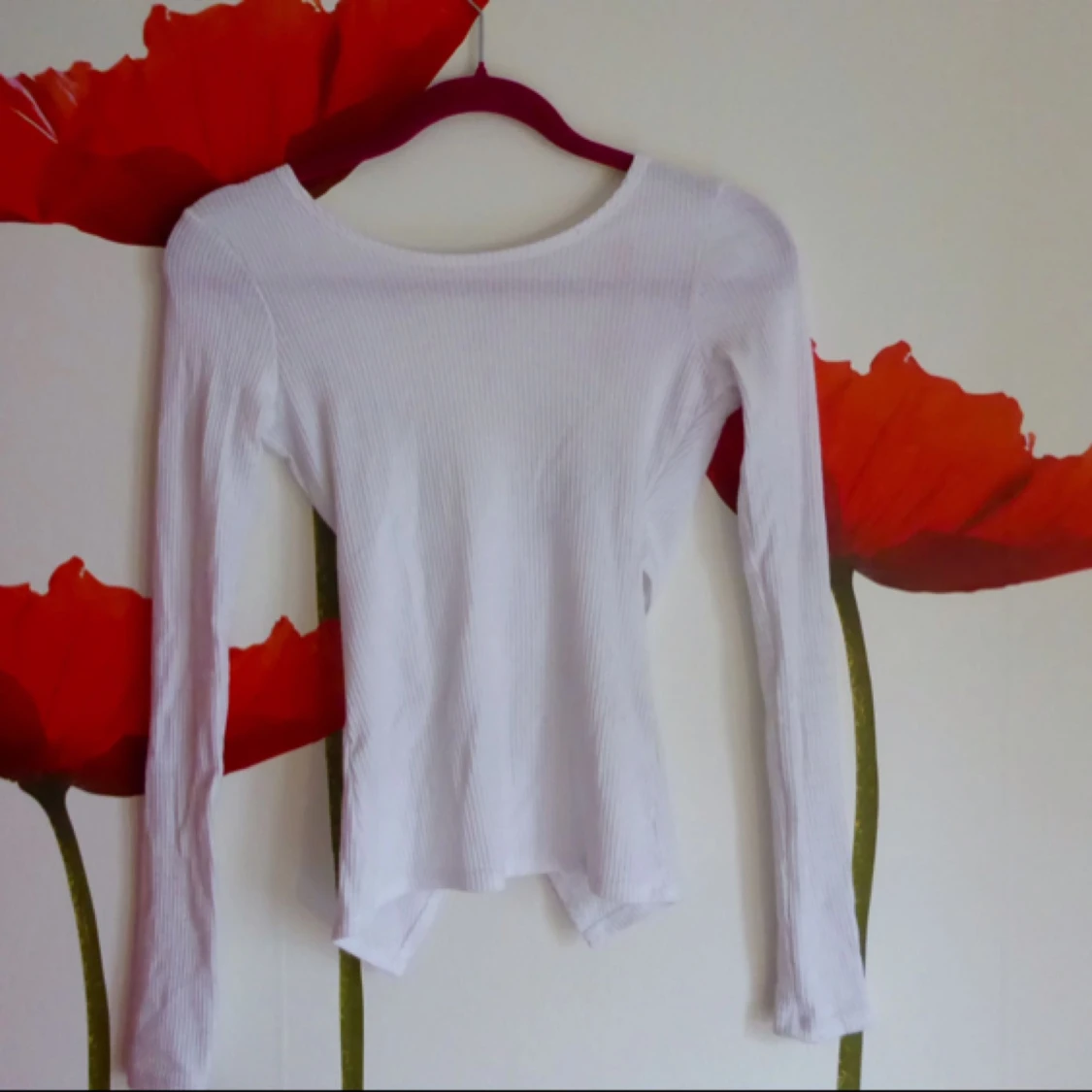 Vit, ribbad, långärmad tröja med superfin, korsad rygg. Som ny. Frakt: 28 kr 🌻