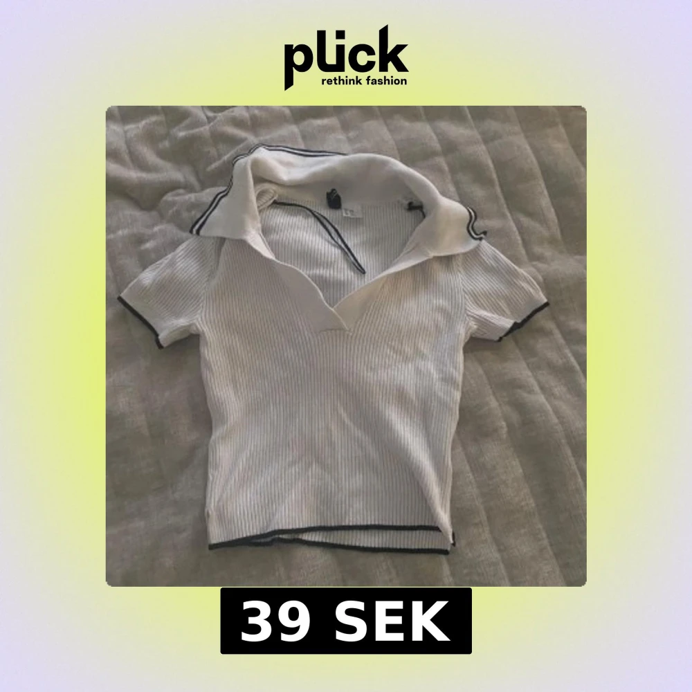 Vit ribbad pikétröja med korta ärmar och svart kant längs krage, ärmslut och nederkant. Tröjan har en klassisk pikékrage med djup v-ringning och är tillverkad i ett stretchigt, stickat material som sitter snyggt på kroppen.
