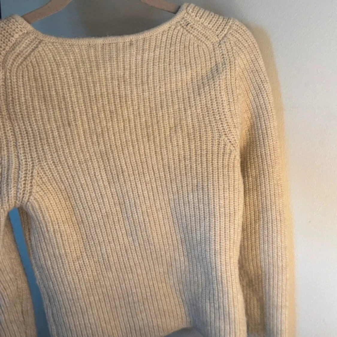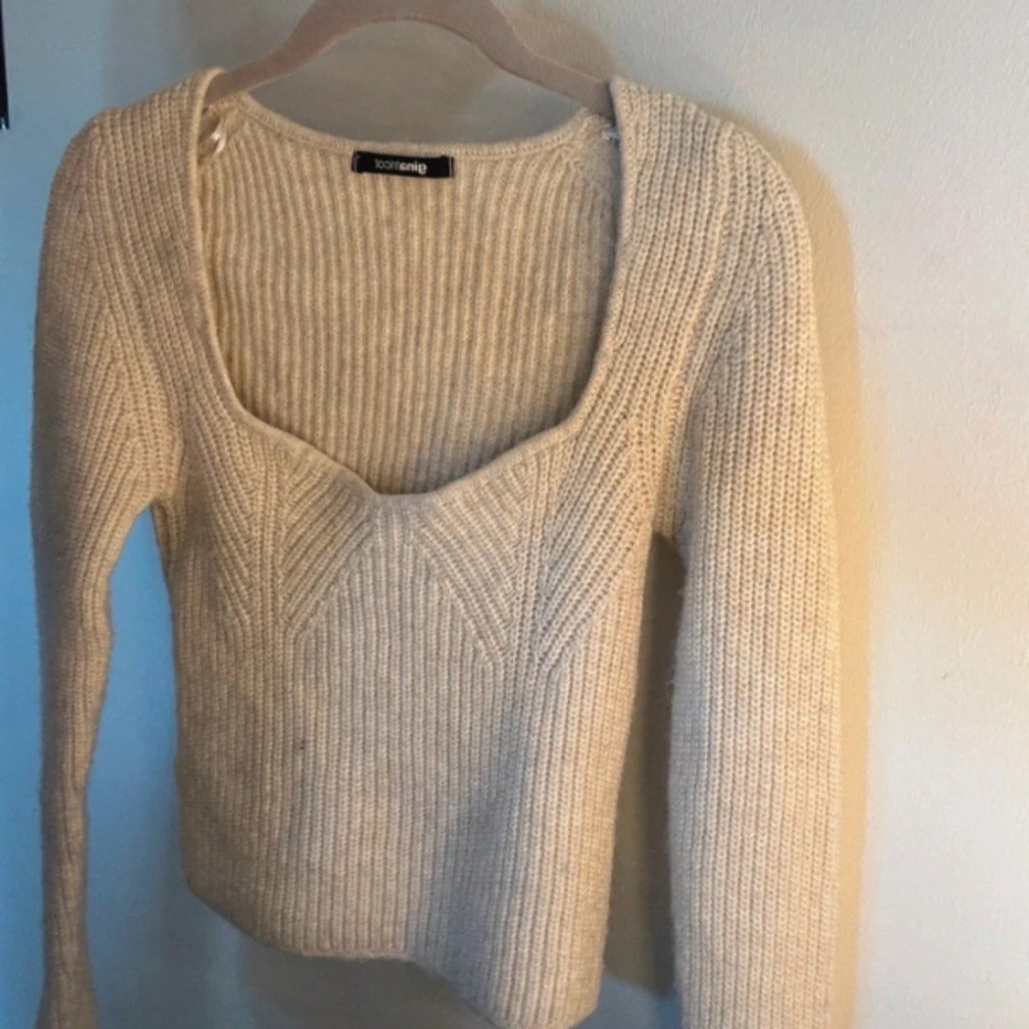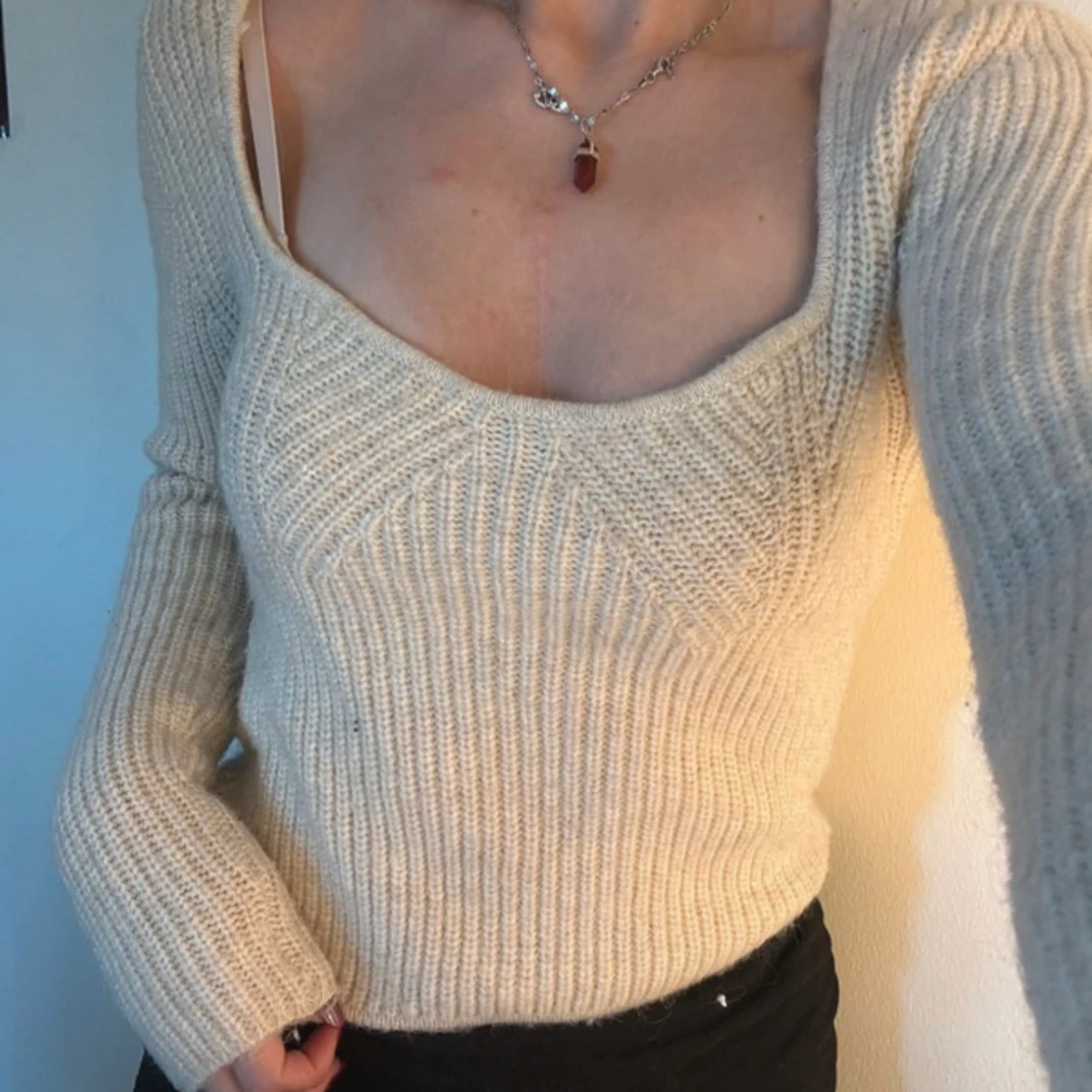 Superfin beige stickad tröja från Gina tricot med djup fyrkantig urringning och långa ärmar. Tröjan har ribbad struktur och är perfekt för lager-på-lager under höst och vinter. Snygg passform som framhäver axlar och dekolletage.