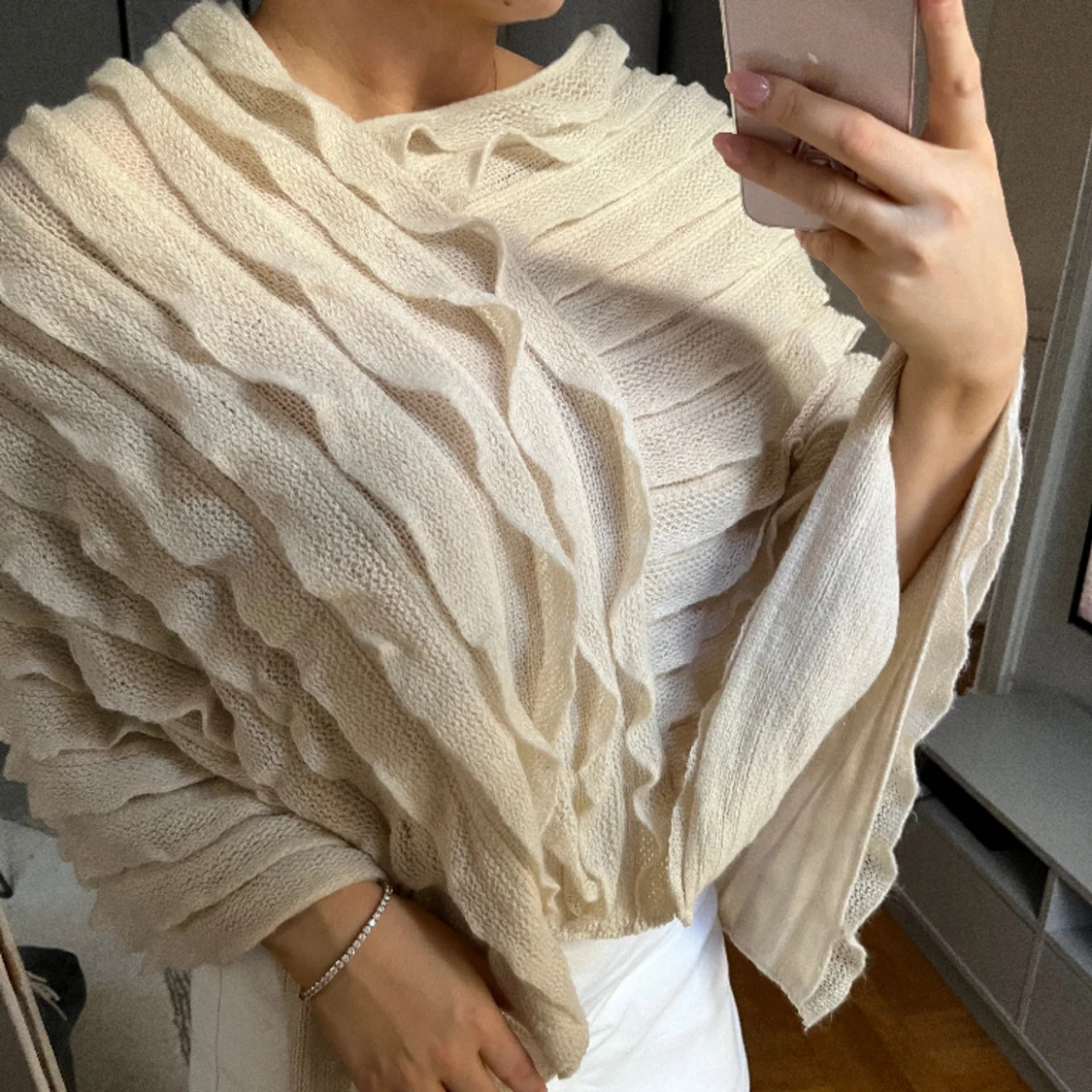 Tröja utan armar, poncho! I beige med volanger. Kan användas utanpå jacka/kappa eller istället för jacka!