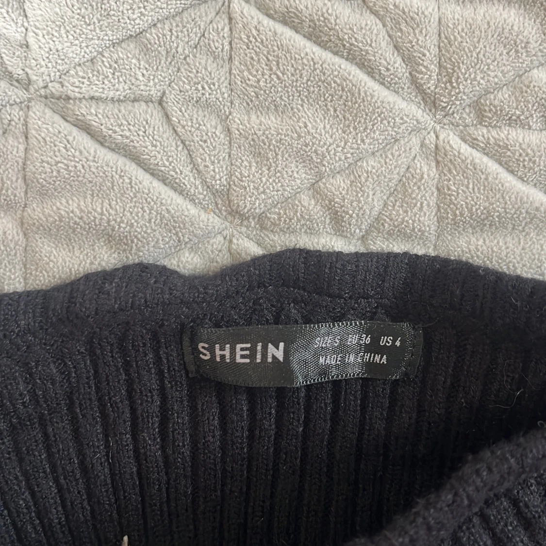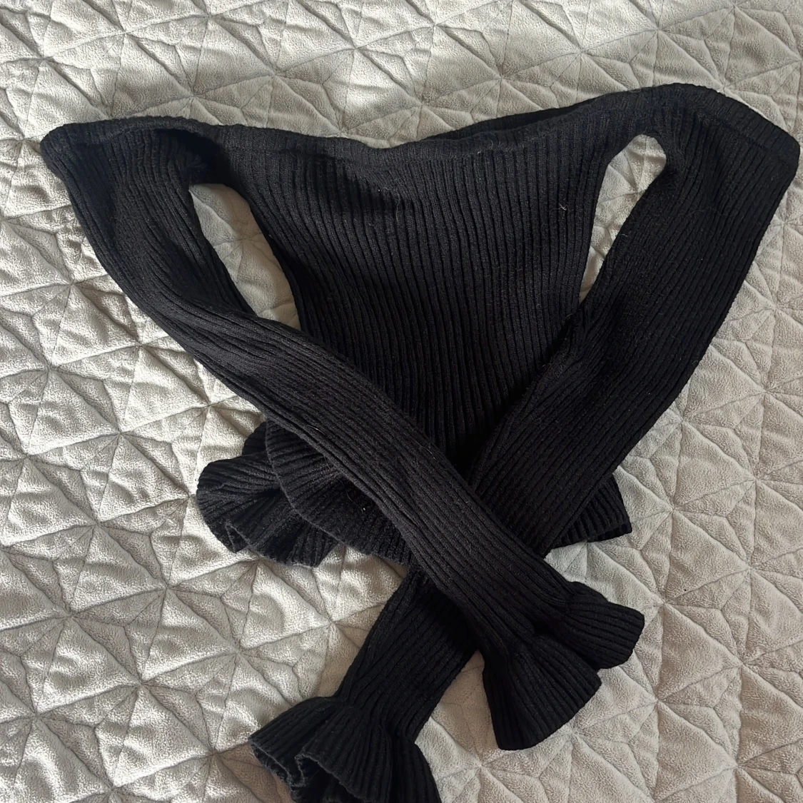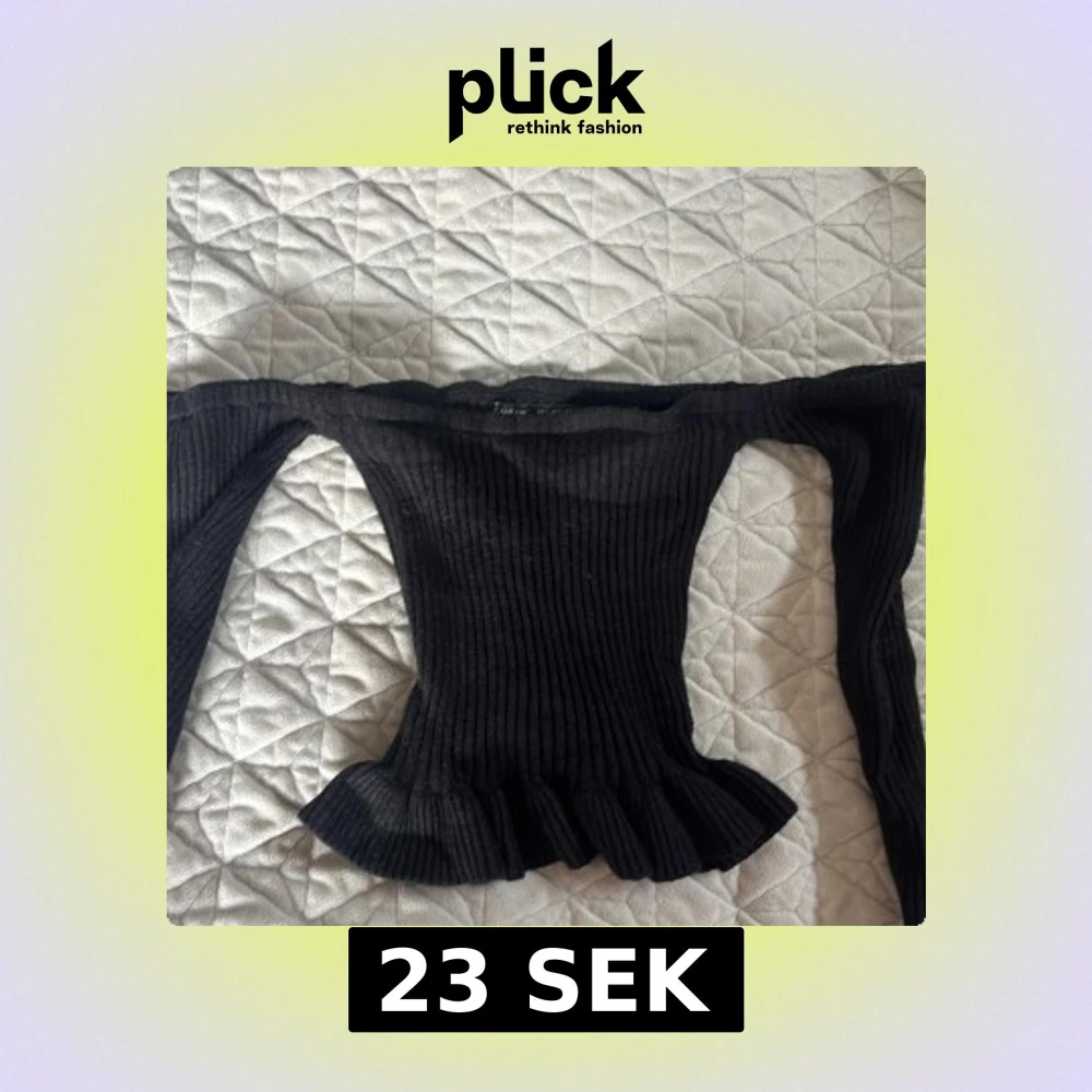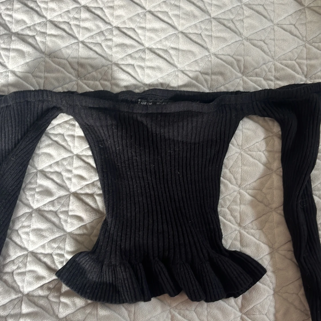 Snygg svart offshoulder topp från SHEIN i ribbat material. Toppen har långa ärmar och en volangdetalj vid nederkanten som ger en extra touch. Perfekt för en stilren look.