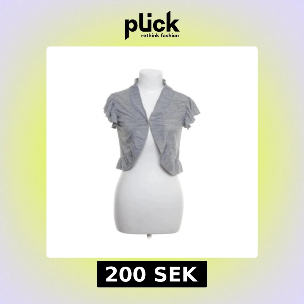 Säljer en ljusgrå bolerotopp från Pieces med korta volangärmar och liten krage. Toppen är öppen framtill och har en mjuk, stickad känsla. Perfekt att slänga över en klänning eller topp för en extra touch.