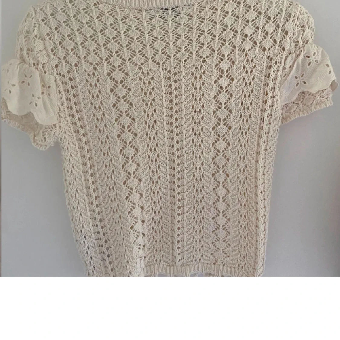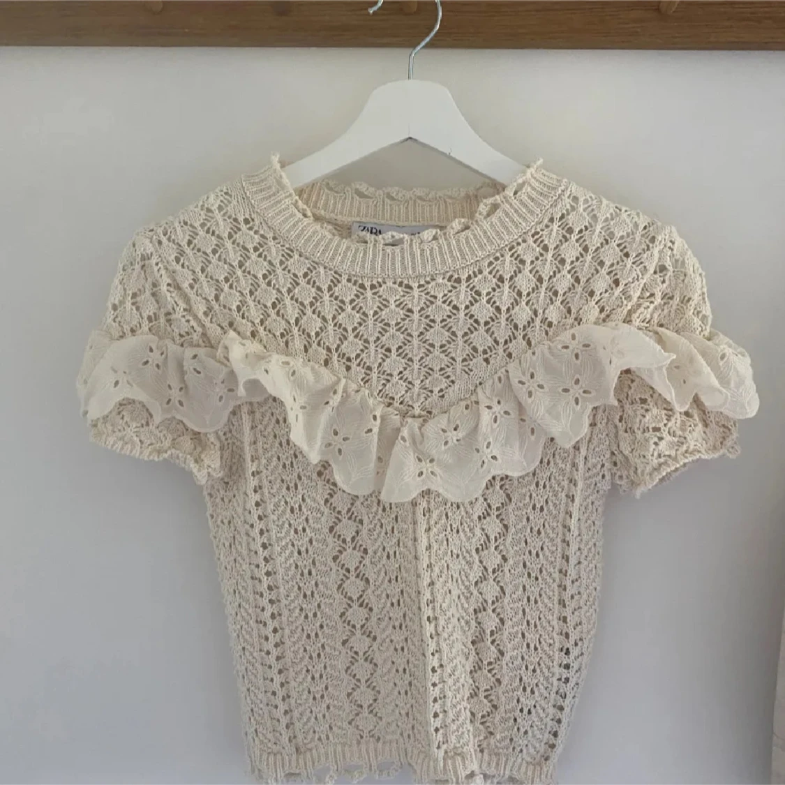 Supersöt beige stickad blus från Zara med korta ärmar och broderad volangdetalj över bröstet. Blusen har ett genombrutet mönster och ribbad halsringning. Perfekt för vår och sommar när du vill ha en romantisk och trendig look.