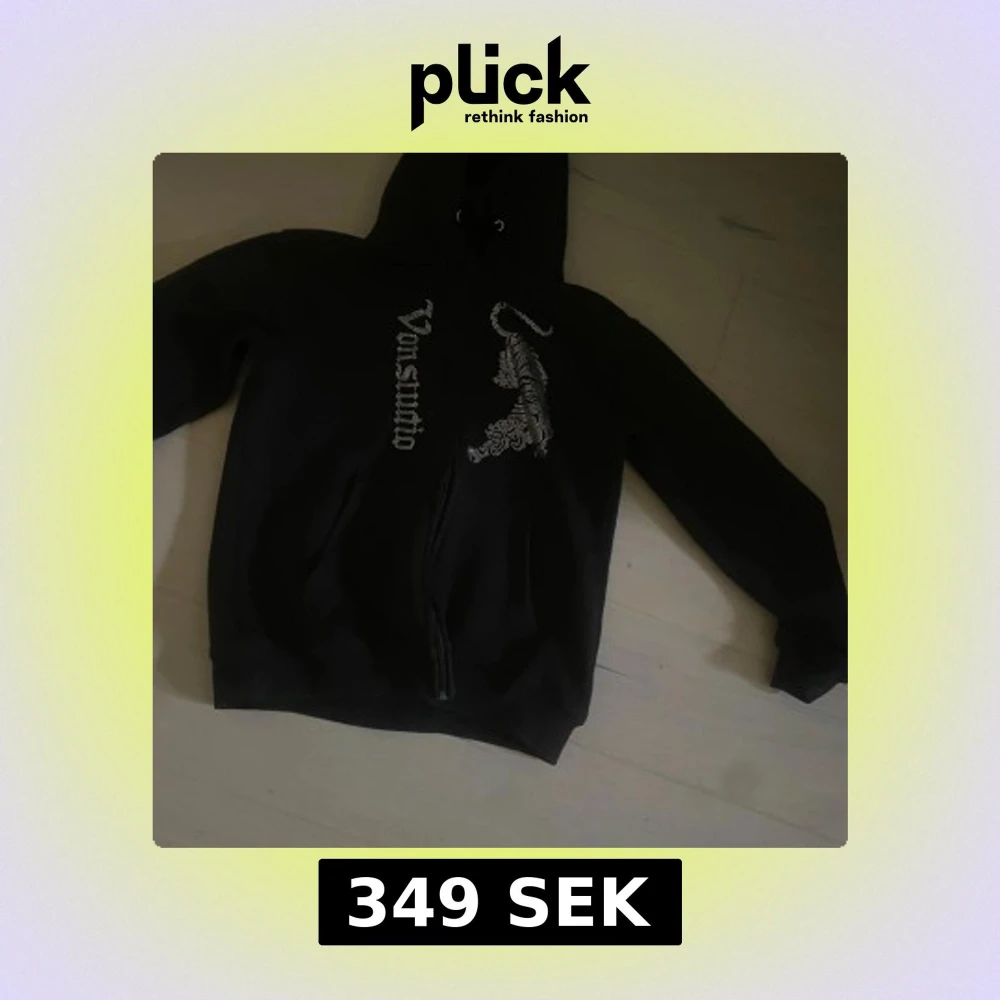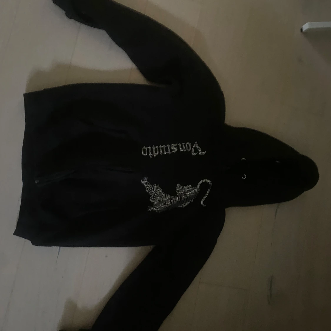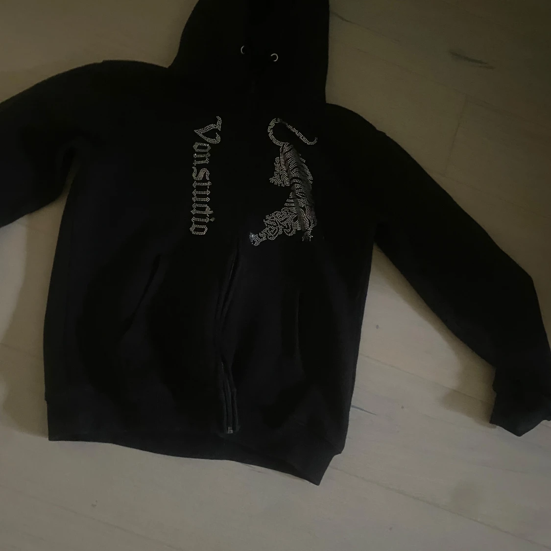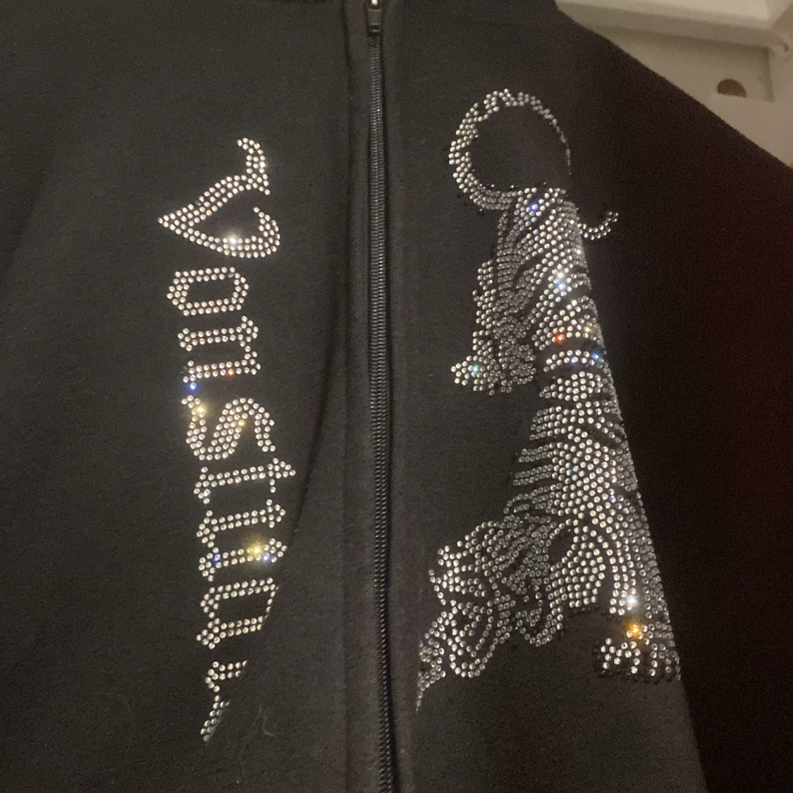 Svart hoodie från Von Studio med dragkedja, huva och långa ärmar. Framsidan har ett glittrigt strassmönster med en tiger och Von Studio-loggan. Perfekt för dig som gillar streetwear med lite extra bling. Materialet känns som mjuk bomull och polyester. Den är i storlek Large