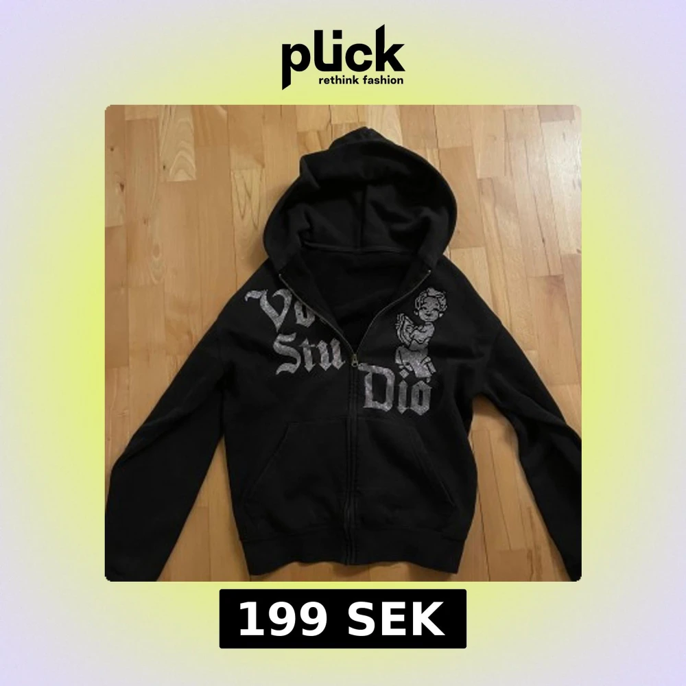 Snygg svart hoodie med dragkedja och rhinestones som bildar text och en figur på framsidan. Perfekt för en cool och avslappnad stil. Den har en klassisk passform med långa ärmar och en praktisk huva.