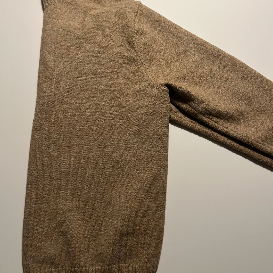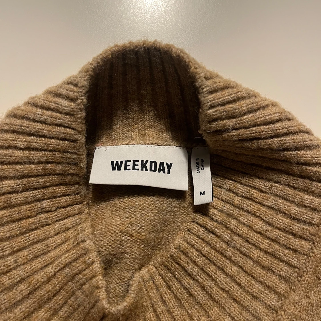 Säljer en stilren beige stickad tröja från Weekday. Tröjan har en hög ribbad krage och långa ärmar, perfekt för kyligare dagar. Den är mjuk och bekväm, idealisk för både vardag och avslappnade tillfällen.