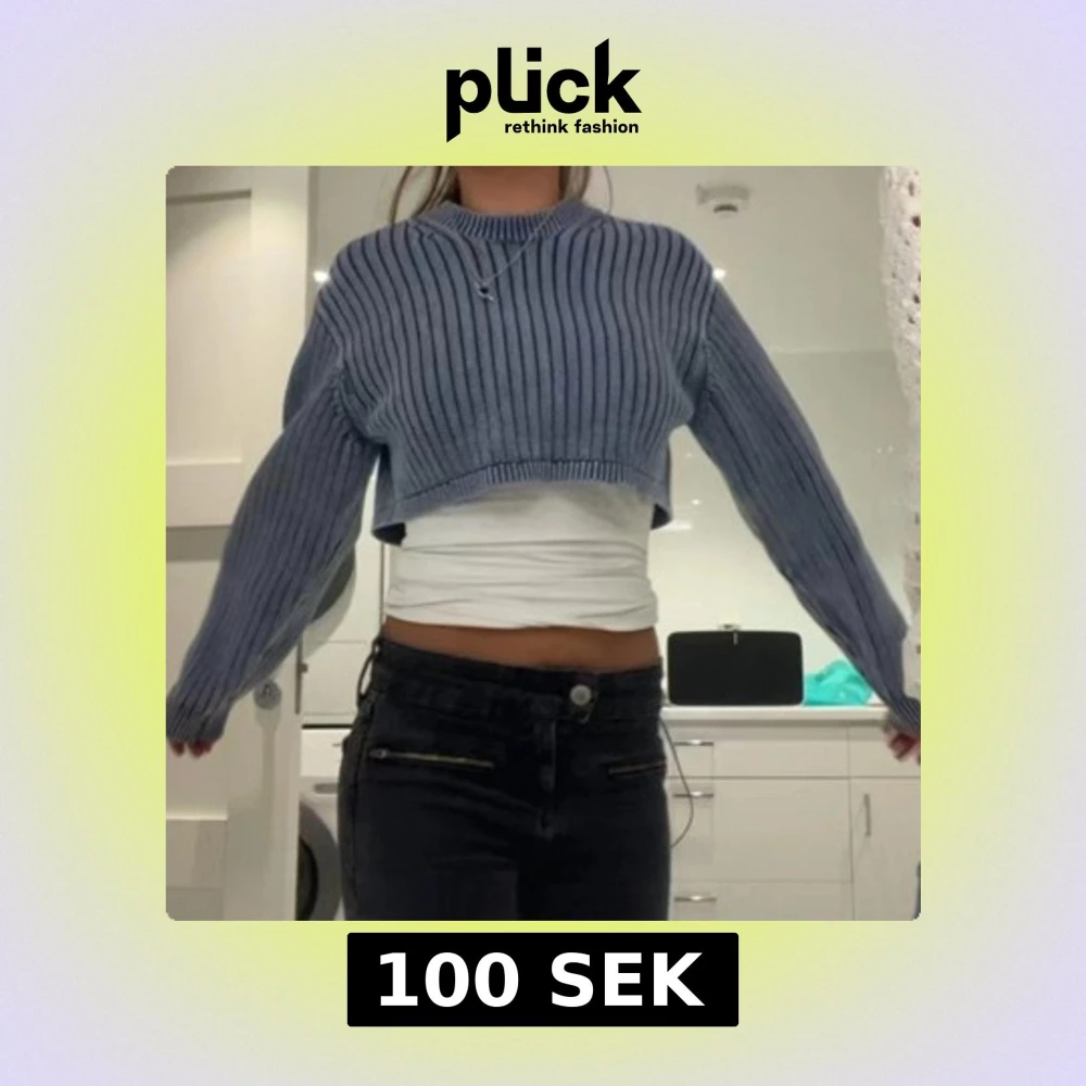 Säljer en blå croppad stickad tröja från Weekday. Tröjan har ribbat mönster, rund halsringning och långa ärmar. Perfekt att ha antingen under ett linne eller annat ❤️