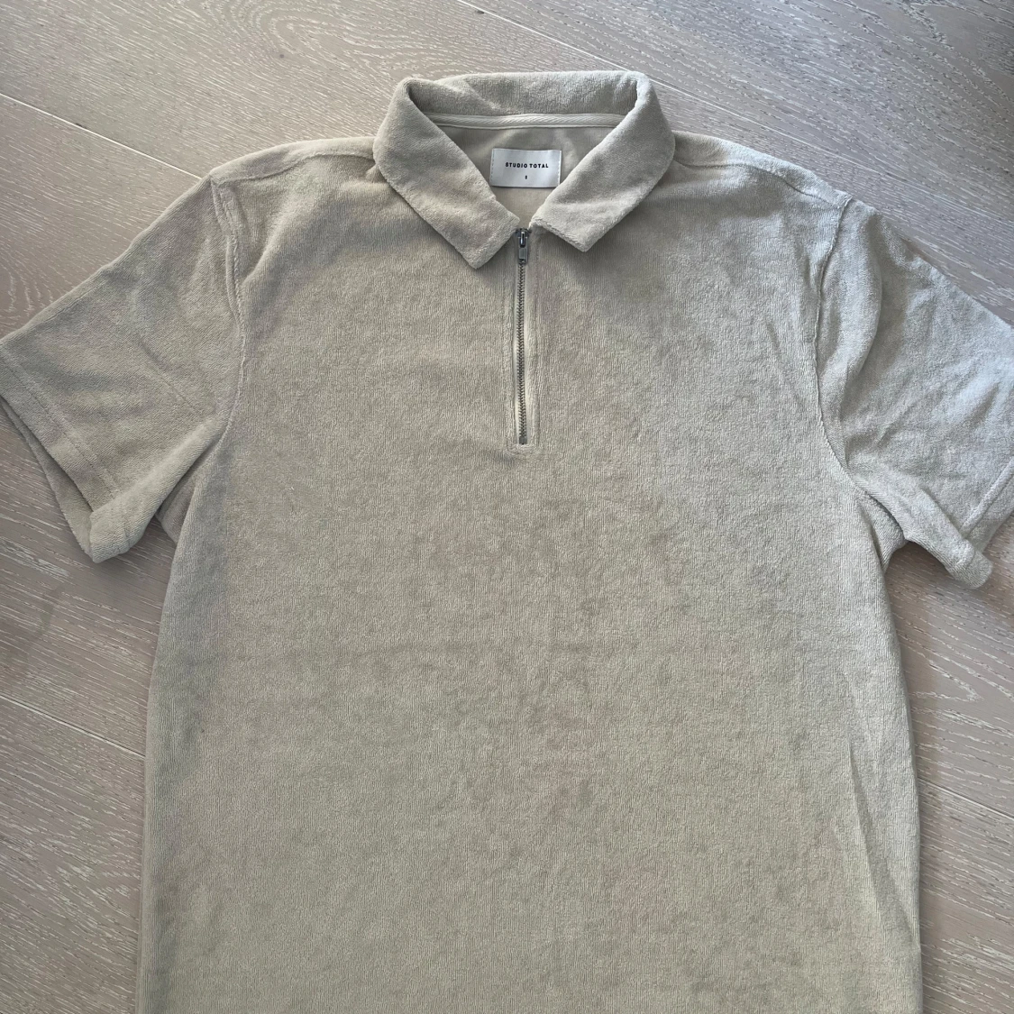 Ny snygg beige pikétröja från Studio Total med korta ärmar och dragkedja framtill. Perfekt för en avslappnad stil. Tröjan har en klassisk krage och är tillverkad i ett mjukt frotté material. Rök och djurfritt hem. Aldrig använd!