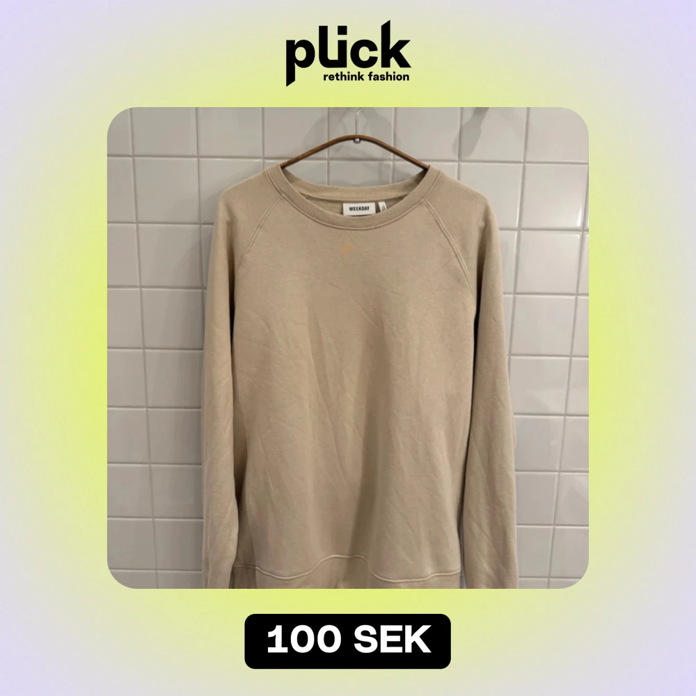 Säljer en stilren beige sweatshirt från Weekday i mycket bra skick. Den har en klassisk rund hals och långa ärmar, perfekt för både höst och vår. Materialet känns mjukt och skönt, vilket gör den idealisk för vardagsbruk. Passar perfekt för en avslappnad look!