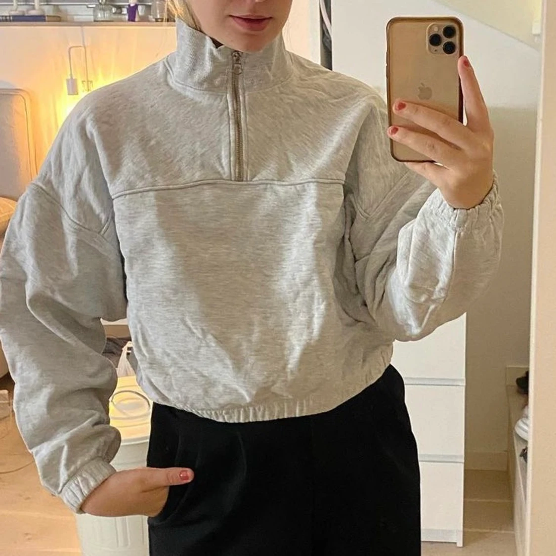 En lite lätt kroppad zip-up. Mycket bra material i fin ljusgrå kulör. Skönheten är från weekday i storlek M. (Frakt betalas av köpare).