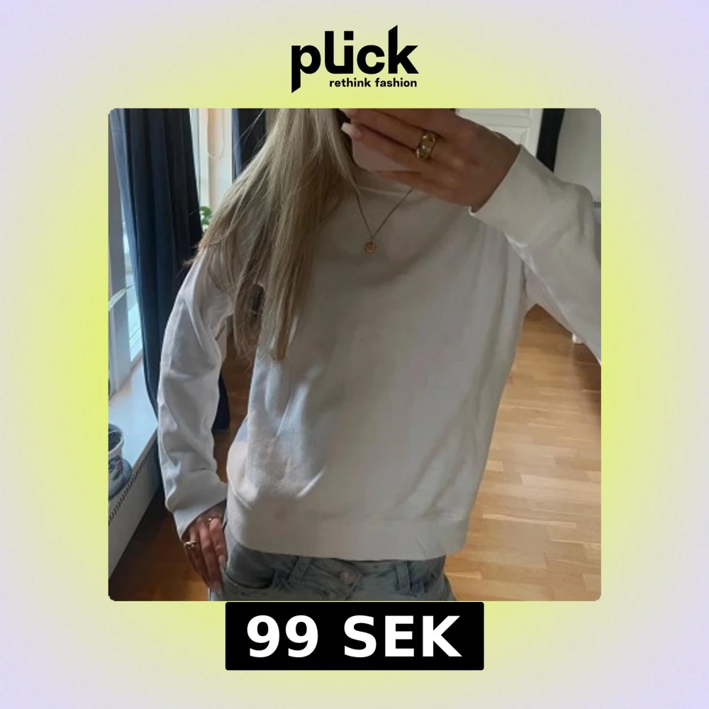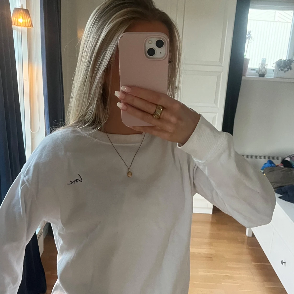Säljer en enkel och stilren vit sweatshirt från Weekday. Tröjan har rund halsringning och långa ärmar. Det står även Love med små bokstäver på tröjan vilket är lite svårt att se på bilden.
