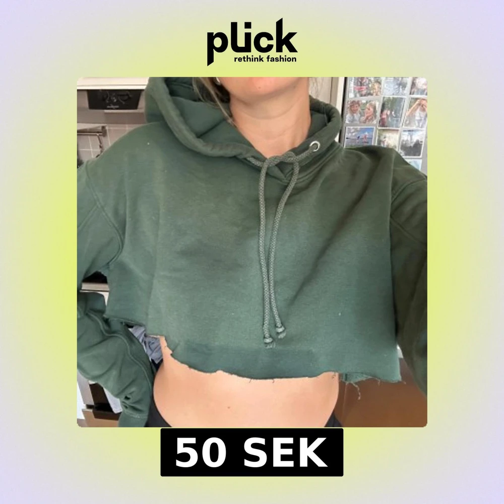 Säljer en mörkgrön croppad hoodie från Weekday i storlek XS. Tröjan har huva med snörning, rå kant nedtill och långa ärmar. Perfekt för dig som gillar en chill och edgy stil. Materialet är mjuk bomull och passformen är loose. Passar medium