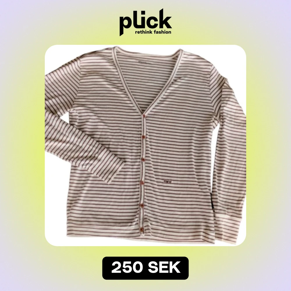 En Whyred Jersey Cardigan, creme vit/beige med bruna ränder i strl L. I fint skick.