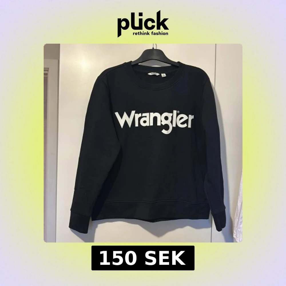 Säljer en svart sweatshirt från Wrangler med deras ikoniska logga i vitt på framsidan. Tröjan har långa ärmar och en klassisk rund halsringning. Funkar perfekt för både tjejer och killar!