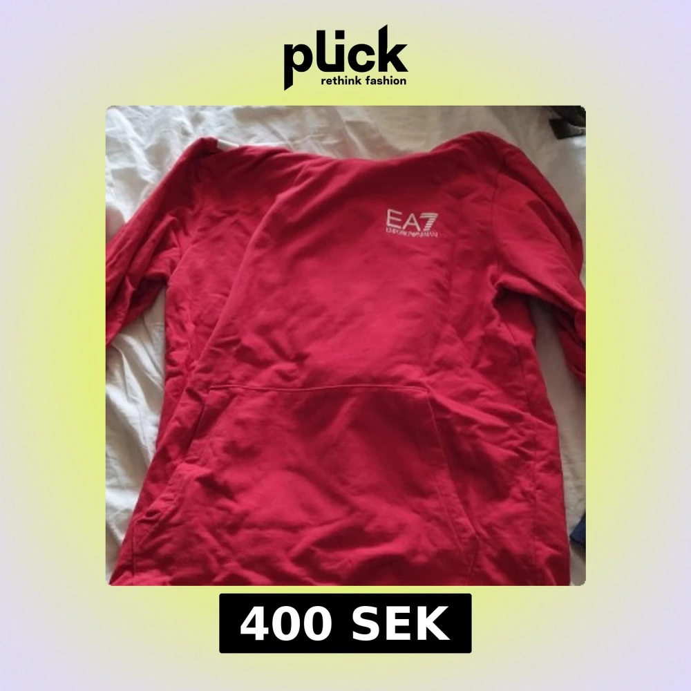 Säljer en röd hoodie från Emporio Armani EA7 med vit logga på bröstet och stort tryck på ryggen. Tröjan har huva och en stor magficka. Perfekt för dig som gillar streetwear och vill sticka ut.