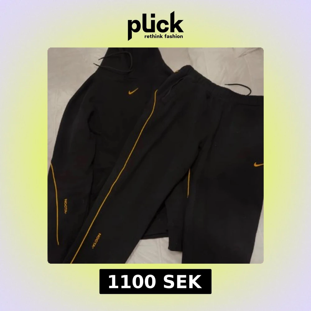 Svart tracksuit från Nike NOCTA med gula detaljer längs ärmarna och liten gul Nike-logga på bröst och ben. Snygg och sportig design, perfekt för en streetwear-look. Storleken är XL men passar även L