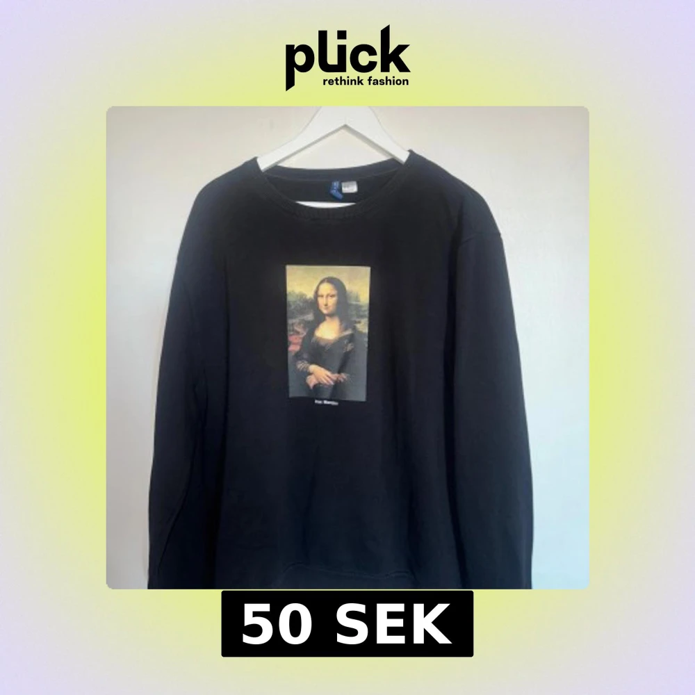 Snygg svart sweatshirt med ett stort tryck av Mona Lisa på framsidan. Tröjan har långa ärmar och en rund halsringning. Perfekt för dig som vill ha en konstnärlig touch i garderoben. Från H&M i stl XL