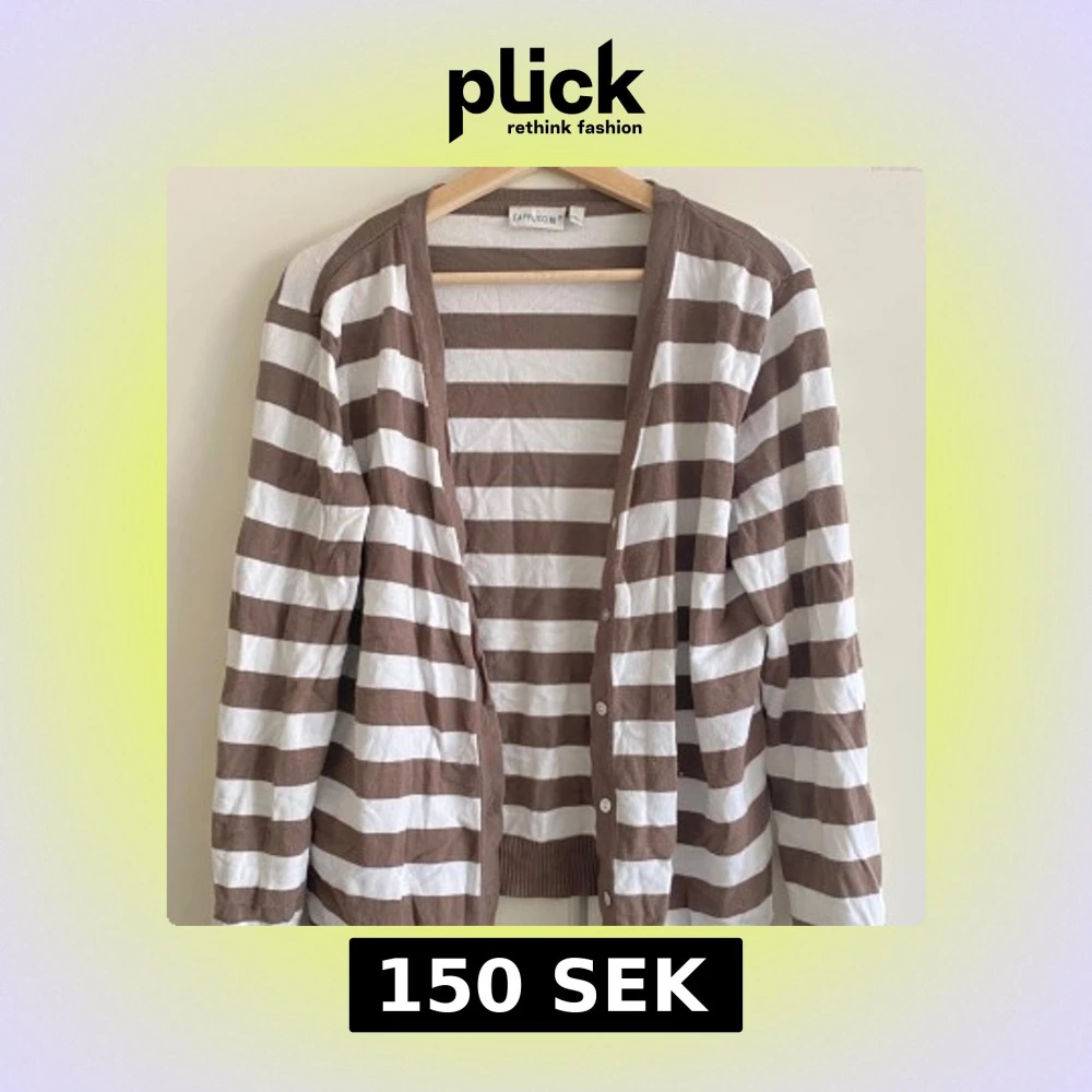Snygg kofta från Cappuccini med breda bruna och vita ränder. Långärmad modell med knappar framtill och ribbade muddar. Perfekt att slänga över en t-shirt för en chill look.