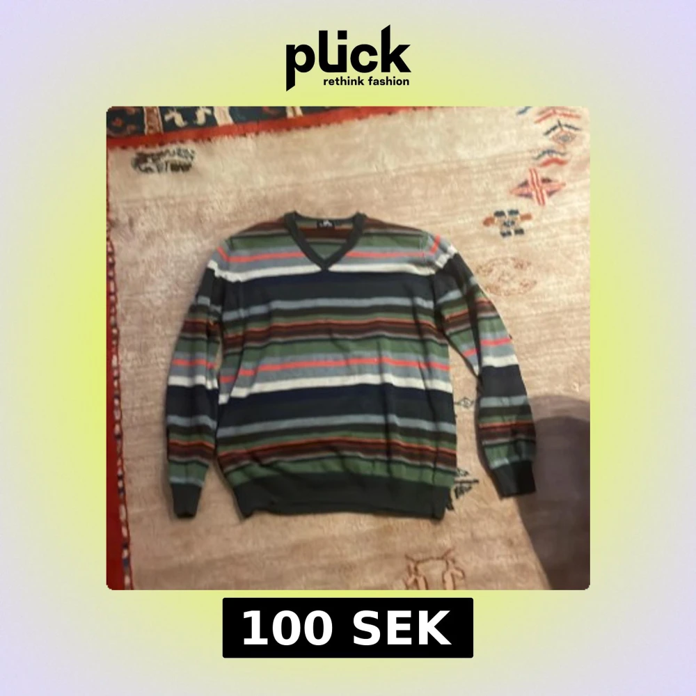 Säljer en snygg randig tröja från U.S. Polo Assn. i olika färger som grön, blå, röd och vit. Tröjan har en v-ringad hals och långa ärmar, perfekt för en avslappnad stil.