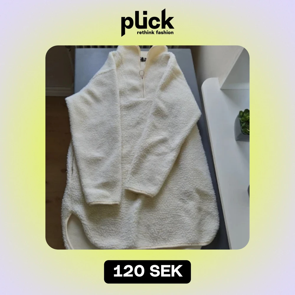 Mysig och varm vit fleece tröja som slutar strax under rumpan från Pieces. Perfekt för kyliga dagar med sin mjuka och fluffiga textur. Tröjan har en halv dragkedja framtill och långa ärmar. Den är i bra skick och redo att hålla dig varm hela vintern!