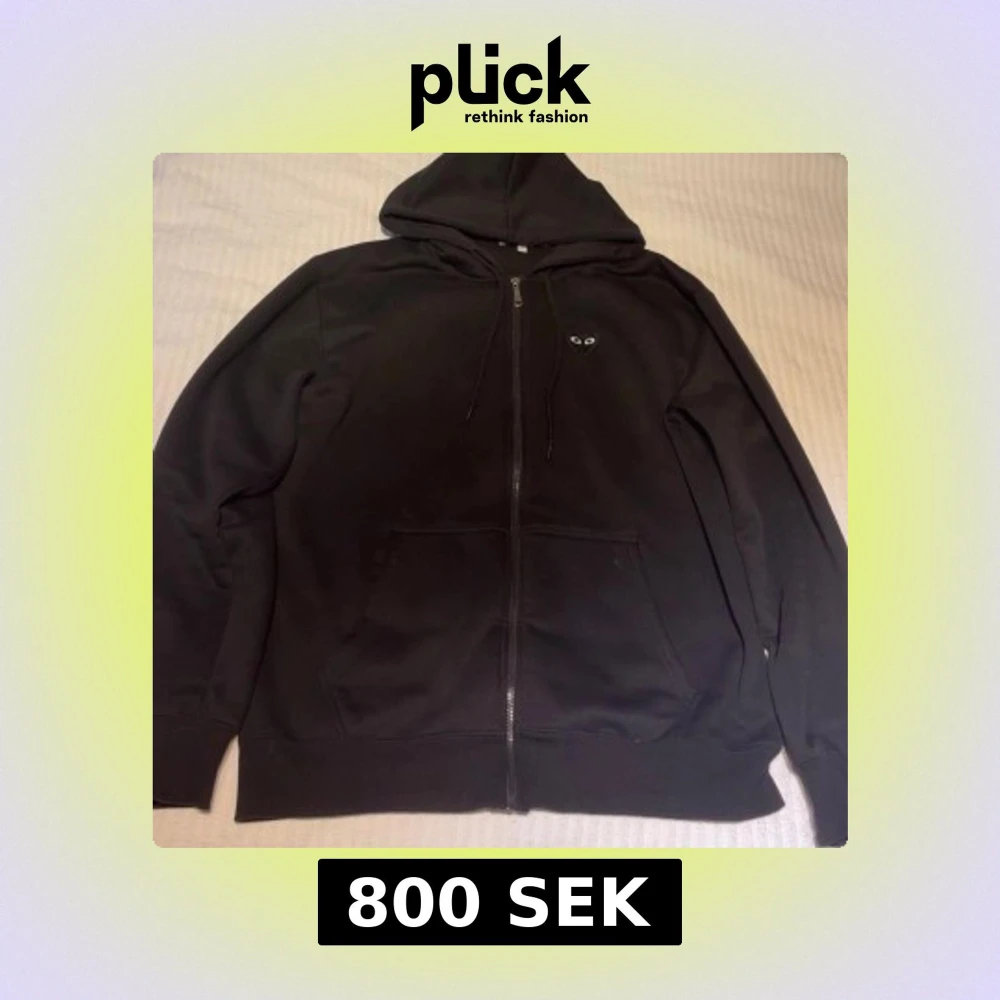 Svart hoodie från Comme des Garçons Play med dragkedja, huva och snörning. Fram på bröstet finns det klassiska hjärtat med ögon i miniformat och en större version på ryggen. Praktiska fickor framtill och mjukt bomullsmaterial. Perfekt för en chill och stilren look.