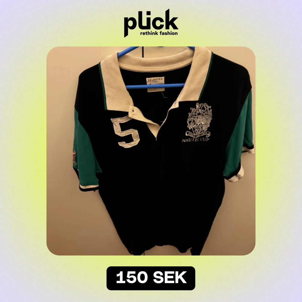 Säljer en snygg pikétröja från Selected Homme i svart och grönt med vit krage. Den har ett coolt nautiskt märke och siffran 5 på framsidan. Perfekt för en avslappnad stil med en touch av elegans. Passar bra till både jeans och chinos!