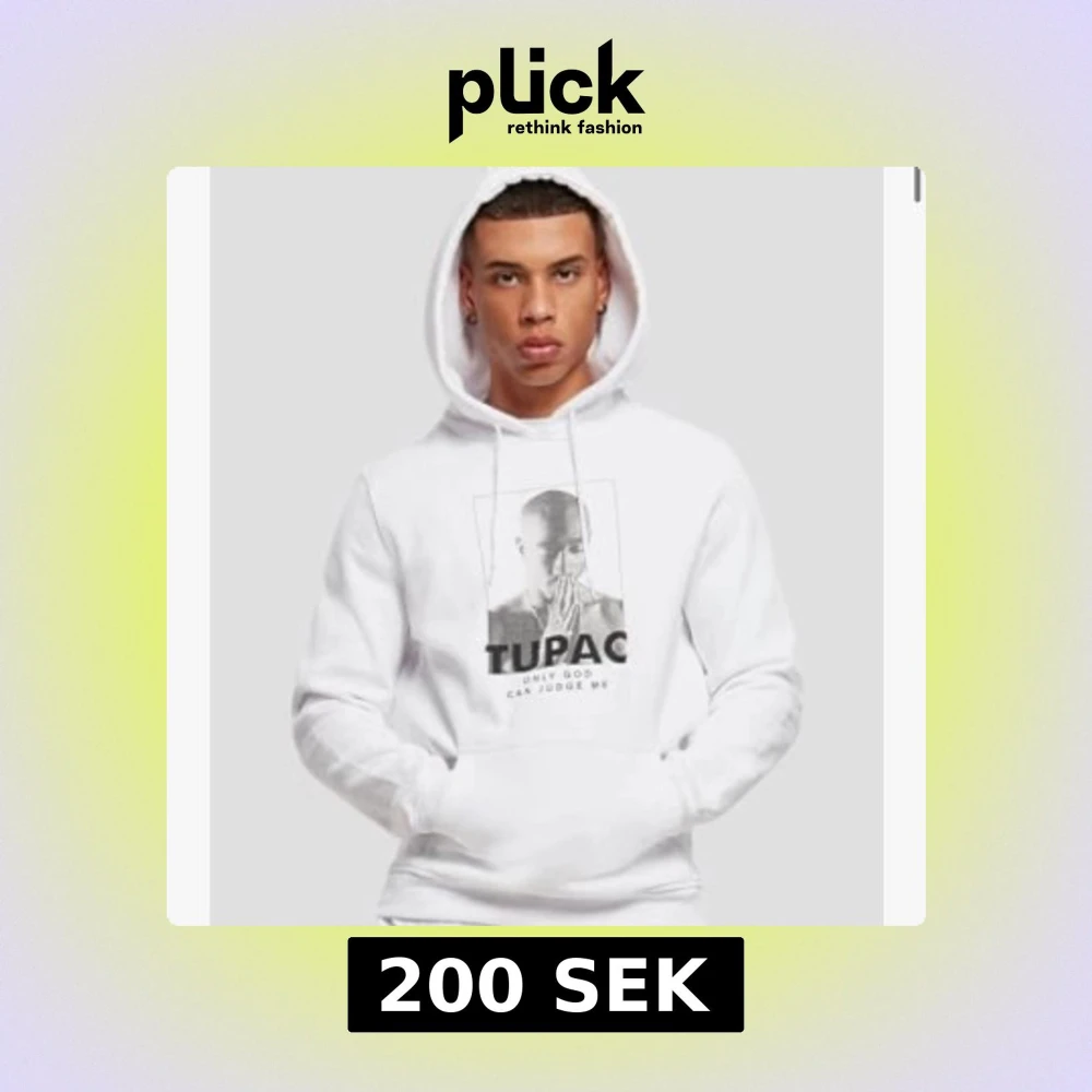 Säljer en vit hoodie med tryck av Tupac och texten 'Only God Can Judge Me' på framsidan. Tröjan har huva och en magficka.