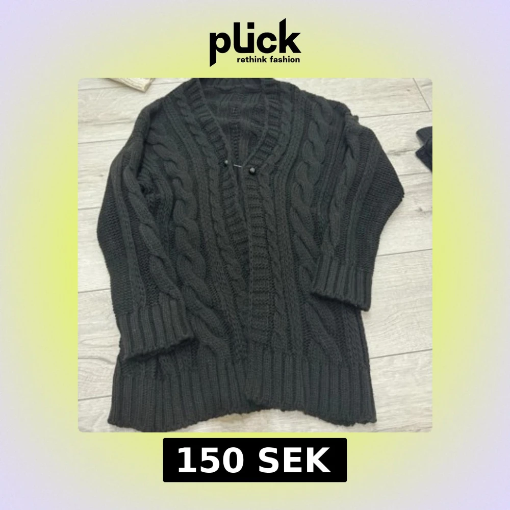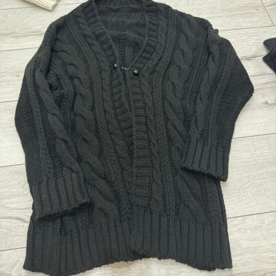 Mysig svart kabelstickad kofta med grova flätmönster och breda ribbade muddar. Koftan har en djup v-ringning och två små knappar framtill. Perfekt för att hålla värmen under kyliga dagar.