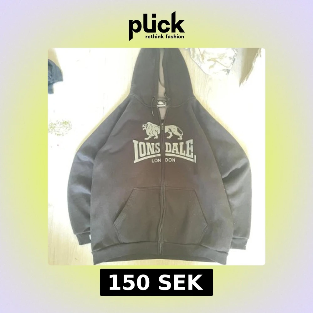 Svart hoodie från Lonsdale London med stort vitt logotryck på bröstet och två ränder längs ärmarna. Tröjan har huva med snörning, dragkedja framtill och känguruficka. Perfekt för en sportig och avslappnad stil.