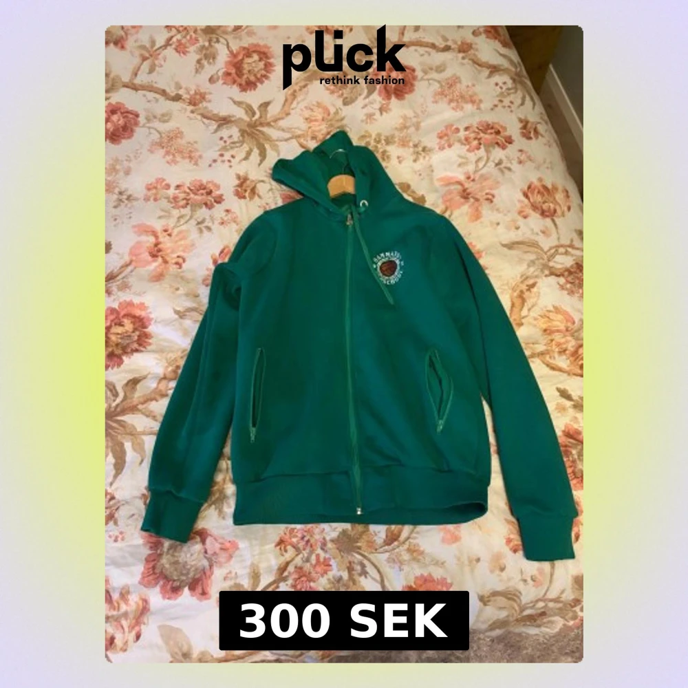Säljer en grön hoodie från Hammarby med tryck på ryggen 'HAMMARBY SÖDERMALM STOCKHOLM' och basketboll-logga på bröstet. Tröjan har huva med snörning, dragkedja framtill och två fickor med zip. Perfekt för dig som vill visa ditt lagstöd.