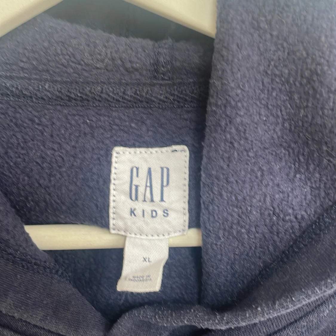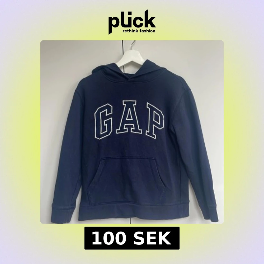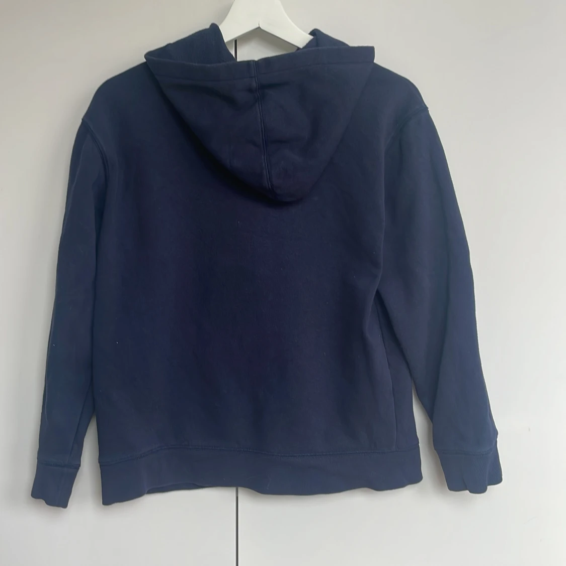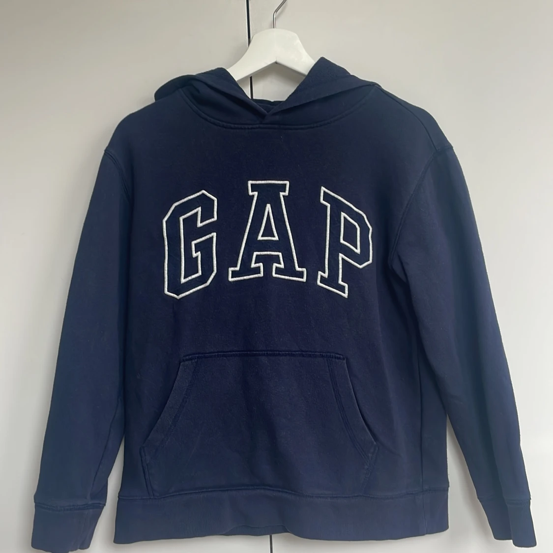 Mörkblå hoodie från GAP Kids med stor vit logga framtill. Tröjan har huva och en klassisk känguruficka. Perfekt för en avslappnad och sportig stil. Liten i storleken och lite korta armar.