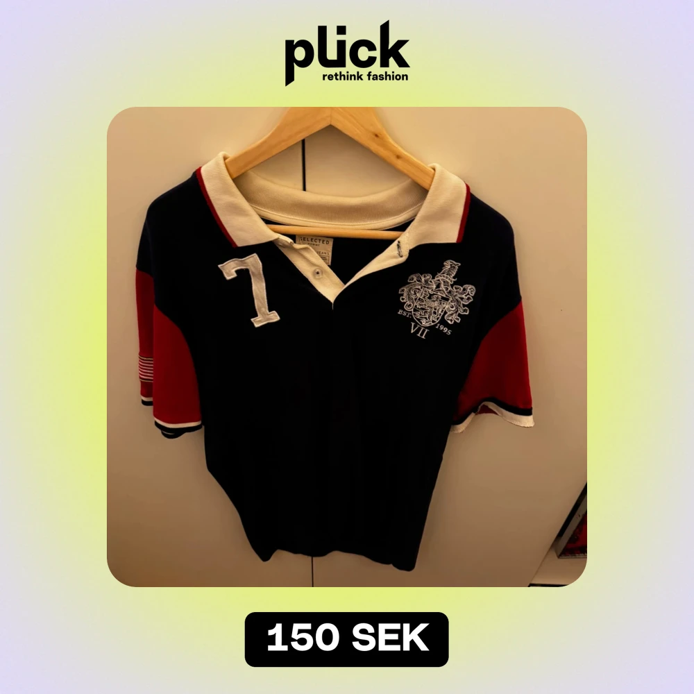 Säljer en snygg svart pikétröja från Selected Homme i storlek XL. Tröjan har vita och röda detaljer med ett broderat emblem och siffran 7 på framsidan. Perfekt för en avslappnad men stilren look. Passar både till vardags och fest!