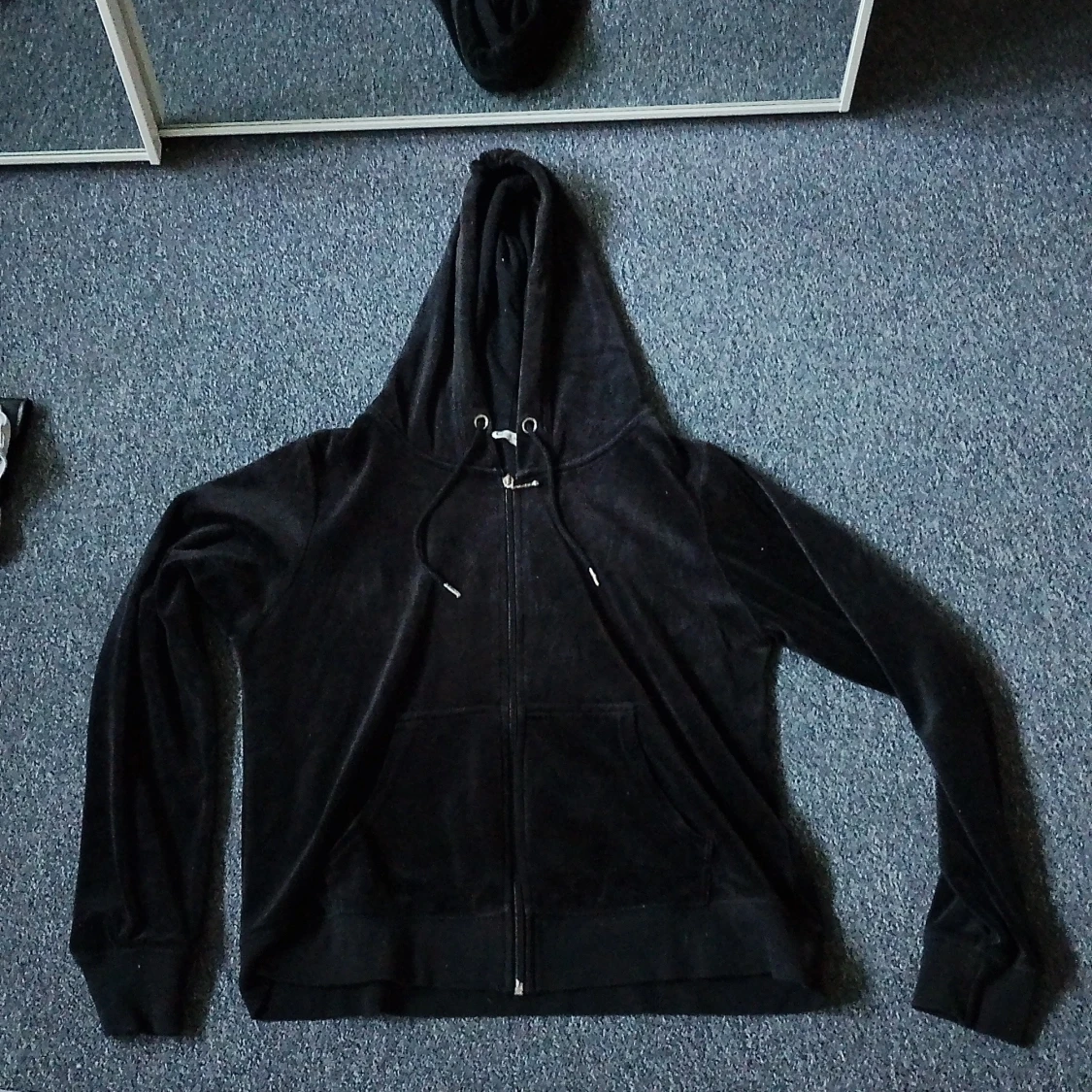 Mjuk och skön svart hoodie i velour från C, storlek XL. Tröjan har huva med snörning, långa ärmar och praktisk dragkedja framtill. Perfekt för chill dagar och har en klassisk känguruficka. Snygg och enkel att matcha med jeans eller mjukis. Kan tvättas innan jag skickar det om du vill😄