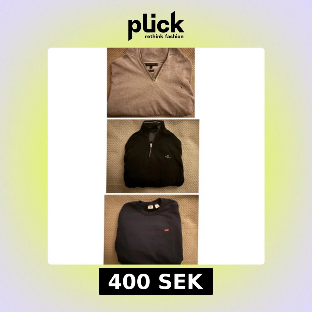 Säljer tre stilrena tröjor: en grå Tommy Hilfiger med dragkedja, en svart Gant med dragkedja och en mörkblå Levis sweatshirt. Alla är storlek XL men jag bär vanligtvis Large. Levis tröjan är helt oanvänd och ny.
